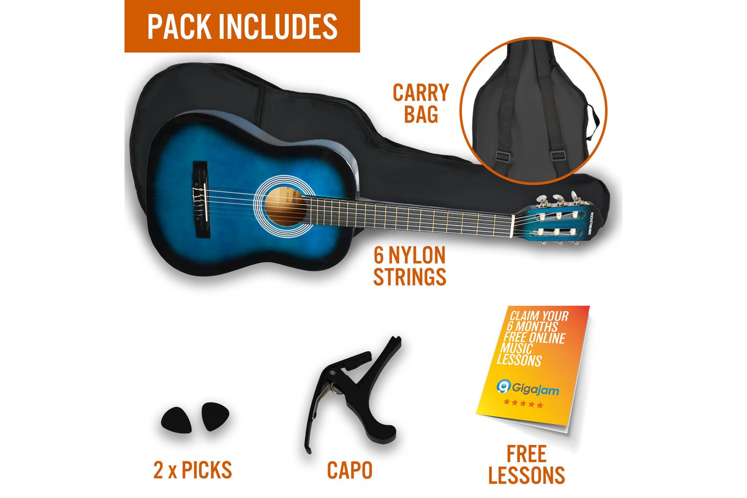 Offering more than your ordinary nylon-string beginner guitar, this exquisite pack comes with a host of goodies to jumpstart your musical journey. Bundled in this deal, you get a lightweight carry bag with a practical shoulder strap and handy accessory pocket, a capo to explore multiple keys, and some robust plectrums for your strumming pleasure.