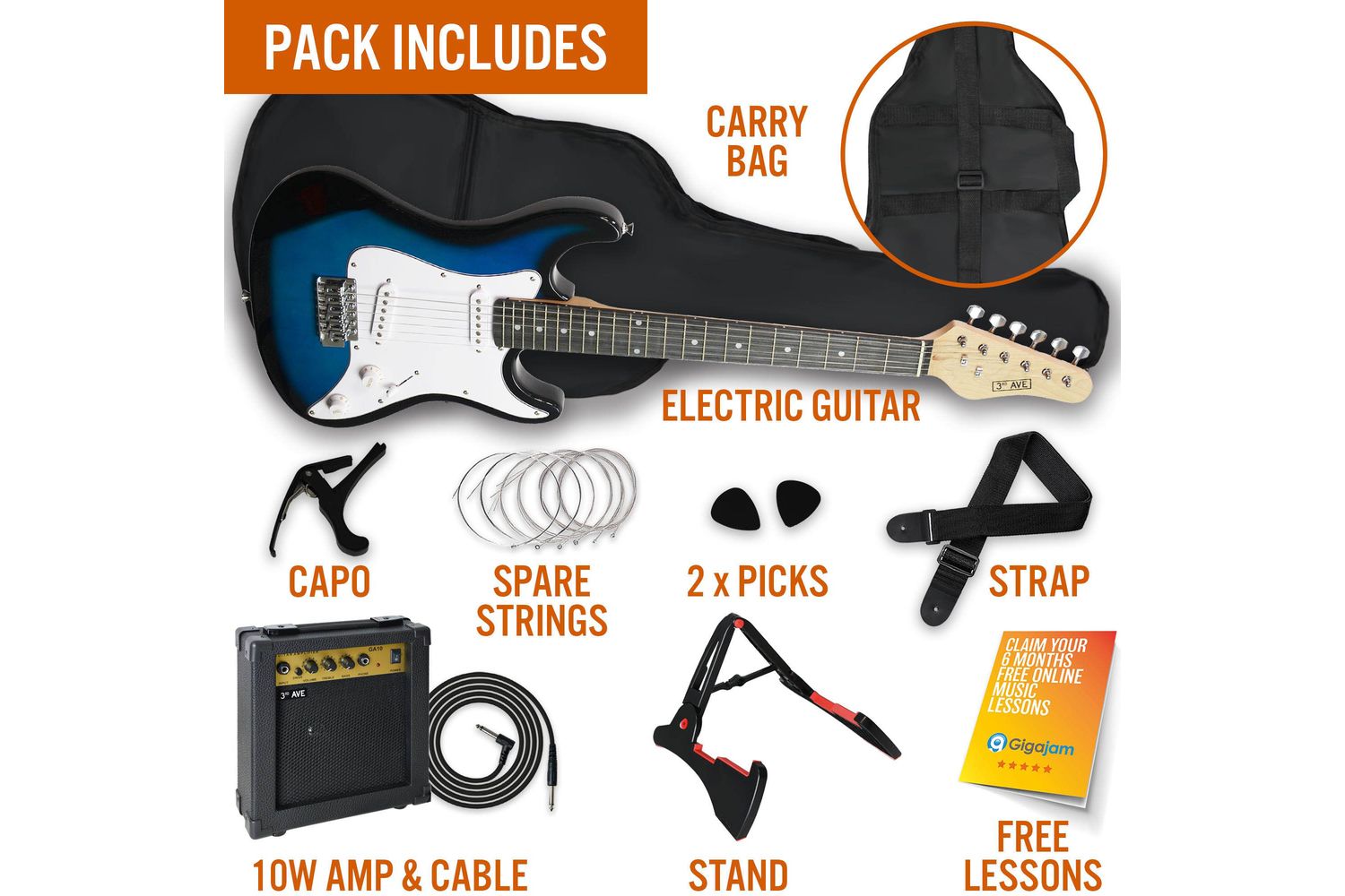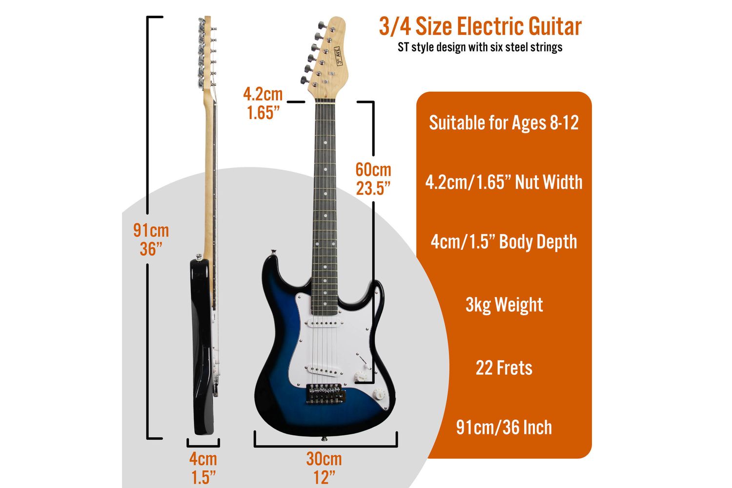 Whether you're a parent keen on encouraging your child’s knack for music or a budding young musician ready to delve into the world of tunes, the 3rd Avenue 34 Size Electric Guitar Pack - Blueburst has it all. Embark on your musical journey right away!