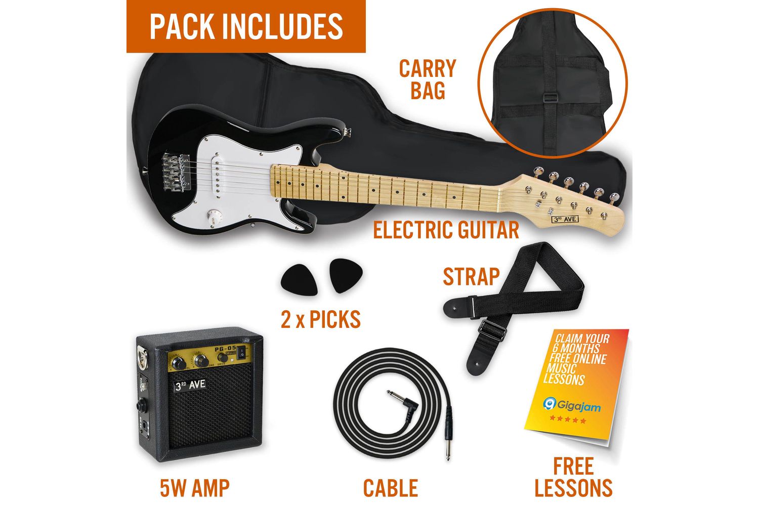 - Junior Guitar Bundle - includes a right-handed junior electric guitar, 5W mini amplifier, picks, guitar strap, lead and a lightweight carry bag