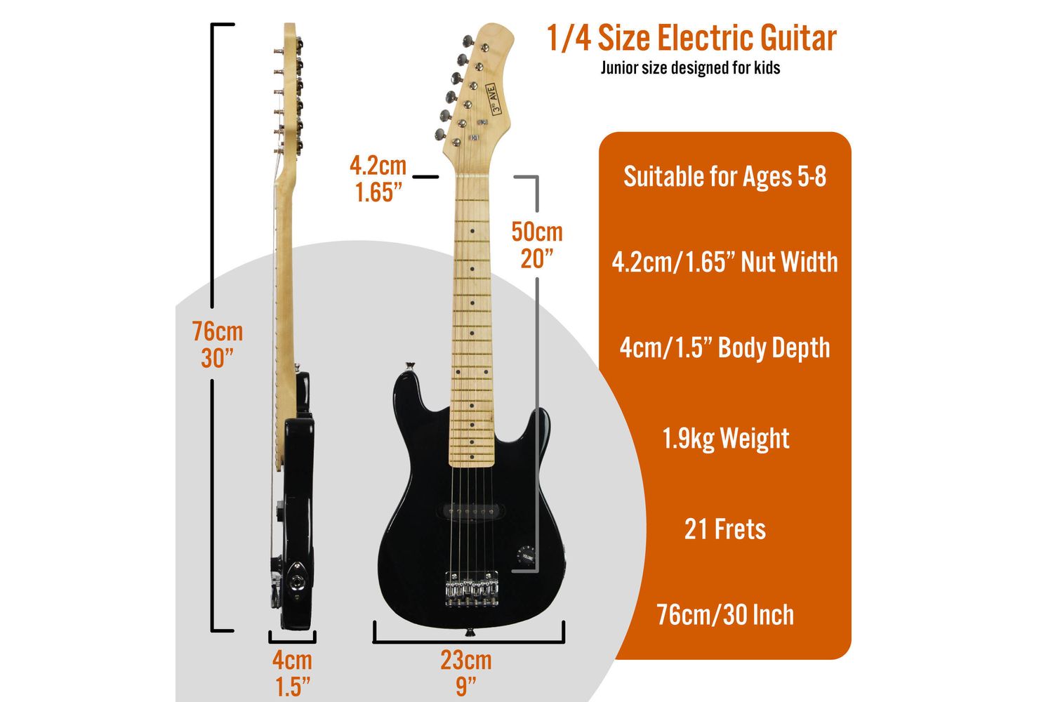 With a 30"/76cm total length and a body width of just 9"/23cm, this guitar is the ideal stepping-stone for future superstars aged from 4 to 8 years old. Its handy size and ergonomic design make this guitar easy to hold, play, and love. And that's not all - the bundle encapsulates the ultimate all-in-one package with a fabric carry bag, collectable picks, convenient strap and a 5W mini amplifier with carry strap and lead.