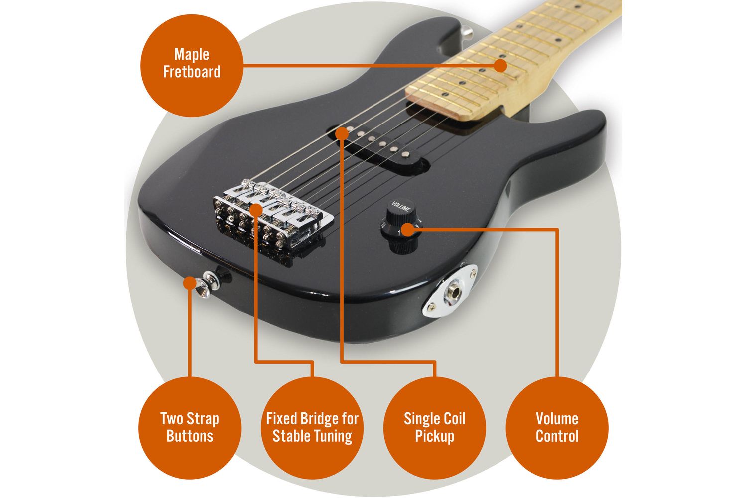 This ST-style junior electric guitar is right at home in your child's hands. Made with high quality materials akin to full-sized electric guitars, it delivers the same impressive sound and playing comfort in a compact, child-friendly design. The guitar's lightweight build and smooth maple fretboard ensure painless learning. The low string action lessens the pressure on your child's fingertips, making the transition into guitar-playing as effortless as it is enjoyable.