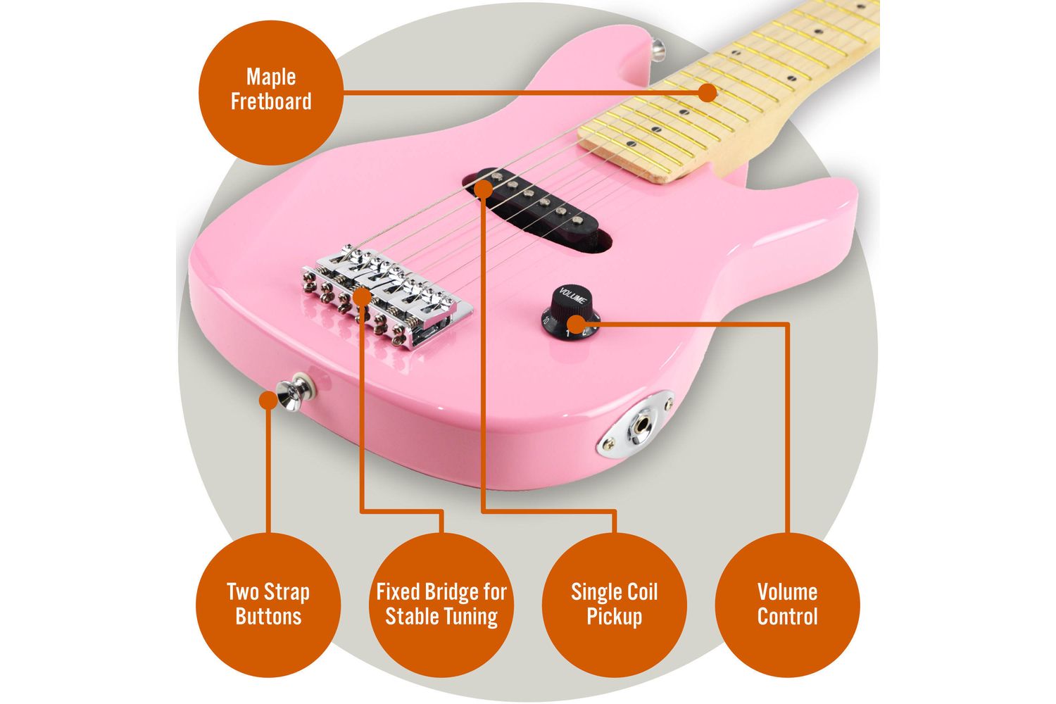 The ergonomic lightweight junior electric guitar features a buttery smooth maple fretboard and a low string action for effortless, fun-filled practice sessions. It offers the right proportioned playability for young rock enthusiasts ages 4 to 8, making it easy for them to learn while they play.