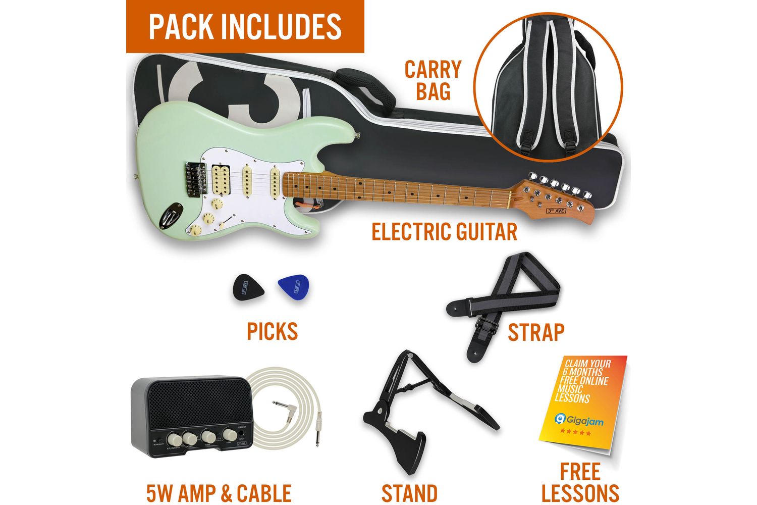 Unleash your musical potential with the 3rd Avenue Stateside Series Electric Guitar Pack in eye-catching Liberty Green colors, meticulously crafted for guitar enthusiasts and beginners alike. Embark on a journey towards mastering the art of music in a cumulative remix of tradition and innovation, combining profound aesthetics, splendid playability, and superior tone quality, handcrafted especially for an Irish audience.