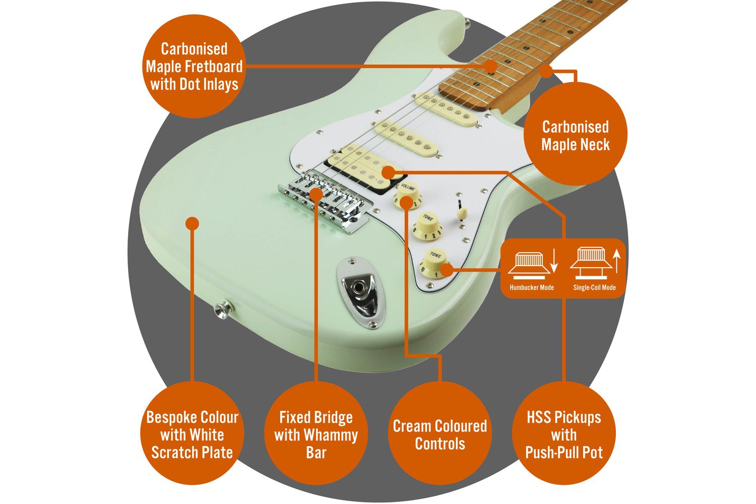 This beauty encapsulates the core musical aesthetics with a treasured H-S-S pickup setup. The unique assembly delivers an expansive range of versatile tones fitting various musical styles—from rock and blues to jazz. Coupled with carbonised neck and a silky-smooth maple fretboard with dot inlays, everything is curated with precision to offer increased comfort and wider resonance. Plus, accurate tuning is at your fingertips with the diecast tuners standing as your loyal allies to deliver stable and precise tuning every time.
