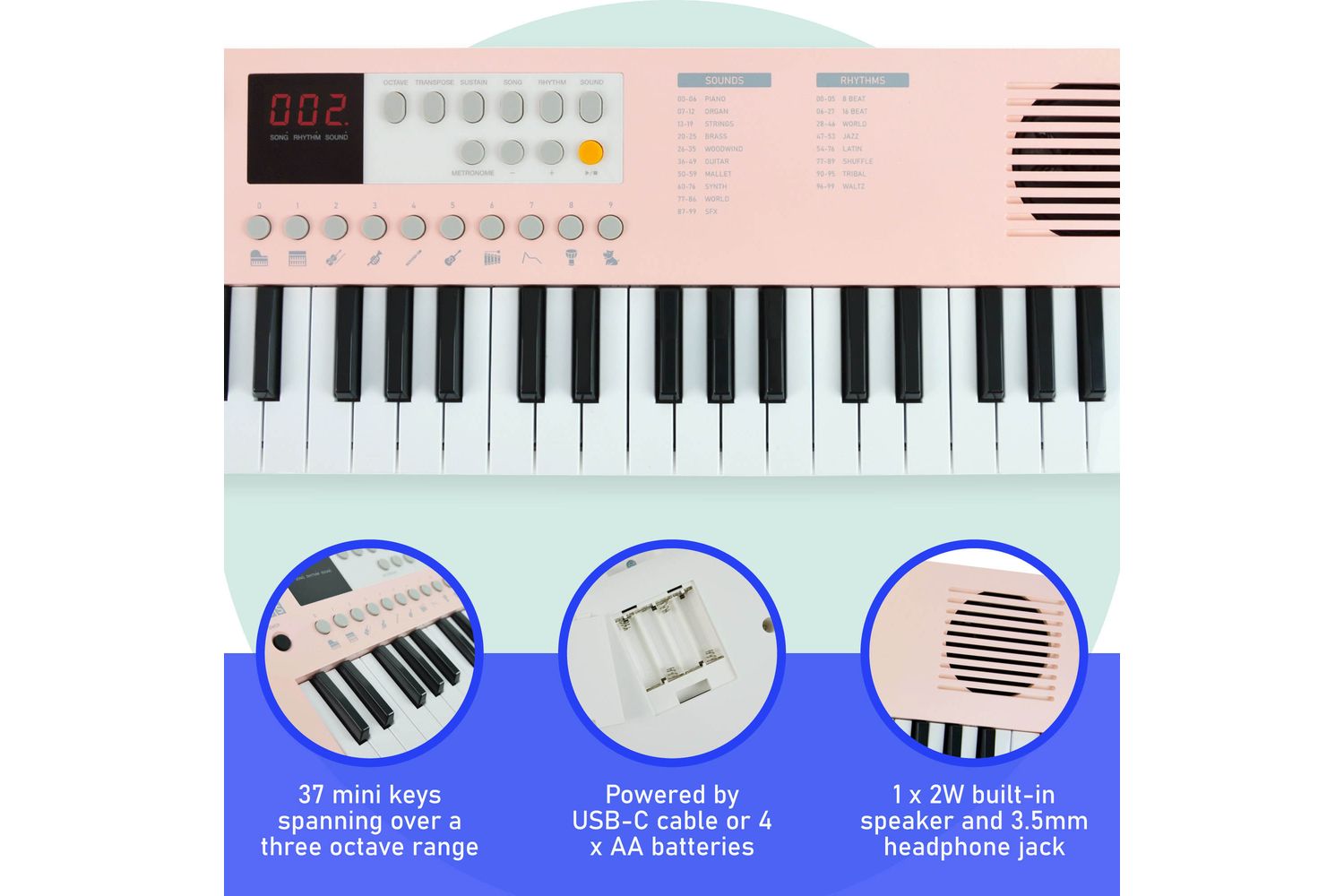 Opportune for learners of all ages, it's designed by factoring in the needs and whims of beginners. With 37 mini keys pocketed in a compact and lightweight design, this pink-hued portable music keyboard makes the impossible - possible. You can take your music wherever you wish to, whether it's your happy little home studio or your dedicated music classroom—the opportunities are boundless.