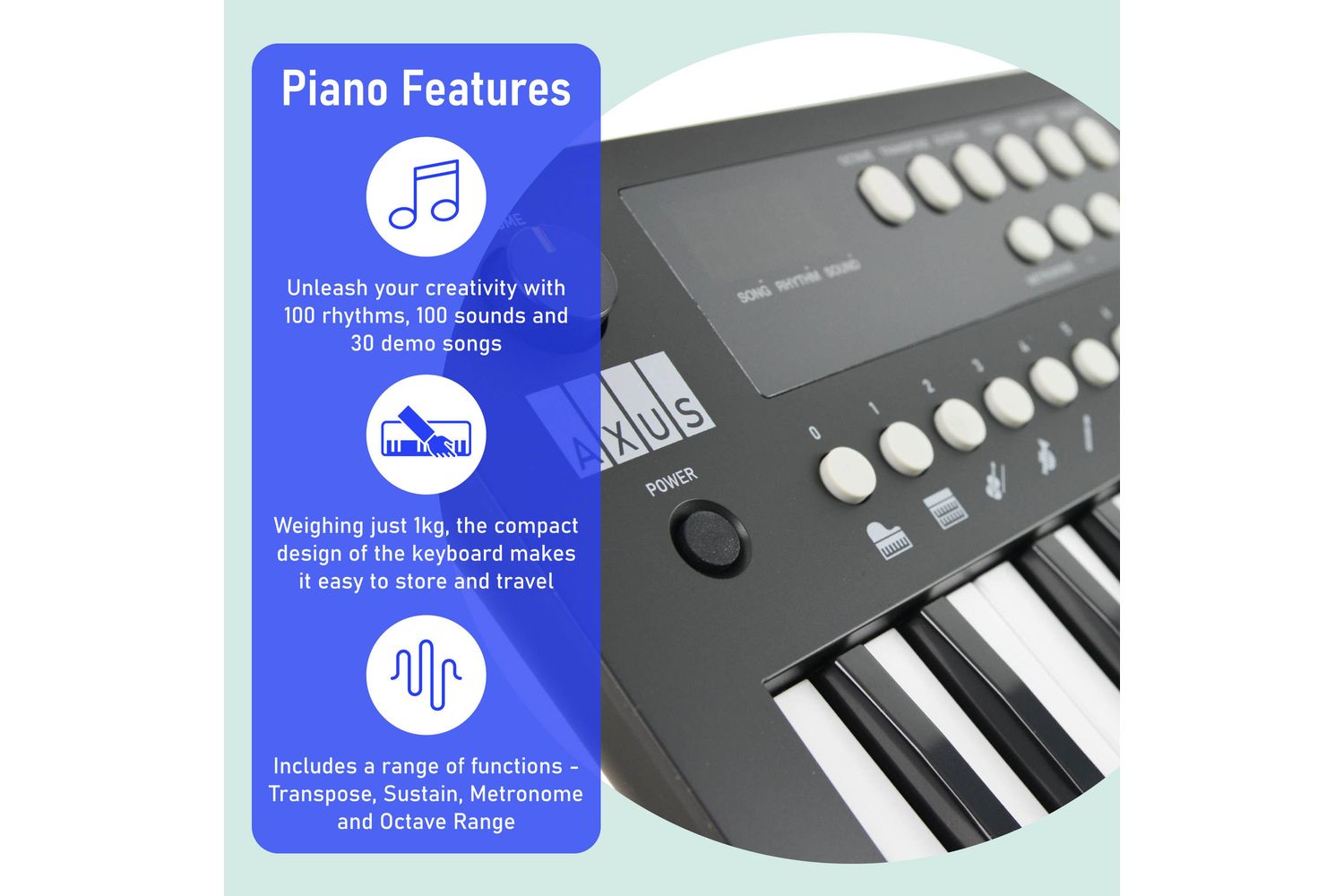 The Axus Mini Keyboard doesn't just play music, it allows you to experiment with 100 unique sounds and rhythms, extending your musical palette beyond your imagination. Added to this is the bonus of 30 demo songs that will foster your appreciation for diverse musical genres and styles.