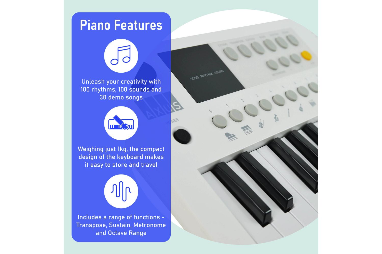 Slim but robust, the Axus Mini Keyboard's features are nothing short of impressive. It boasts an exhaustive range of tunes and rhythms, featuring an incredible set of 100 sounds and 100 rhythms, making it an ideal choice for budding musicians craving for versatility in their musical journey. To enhance the learning experience even further, the keyboard comes packed with 30 demo songs that surely set a robust foundation for music enthusiasts.