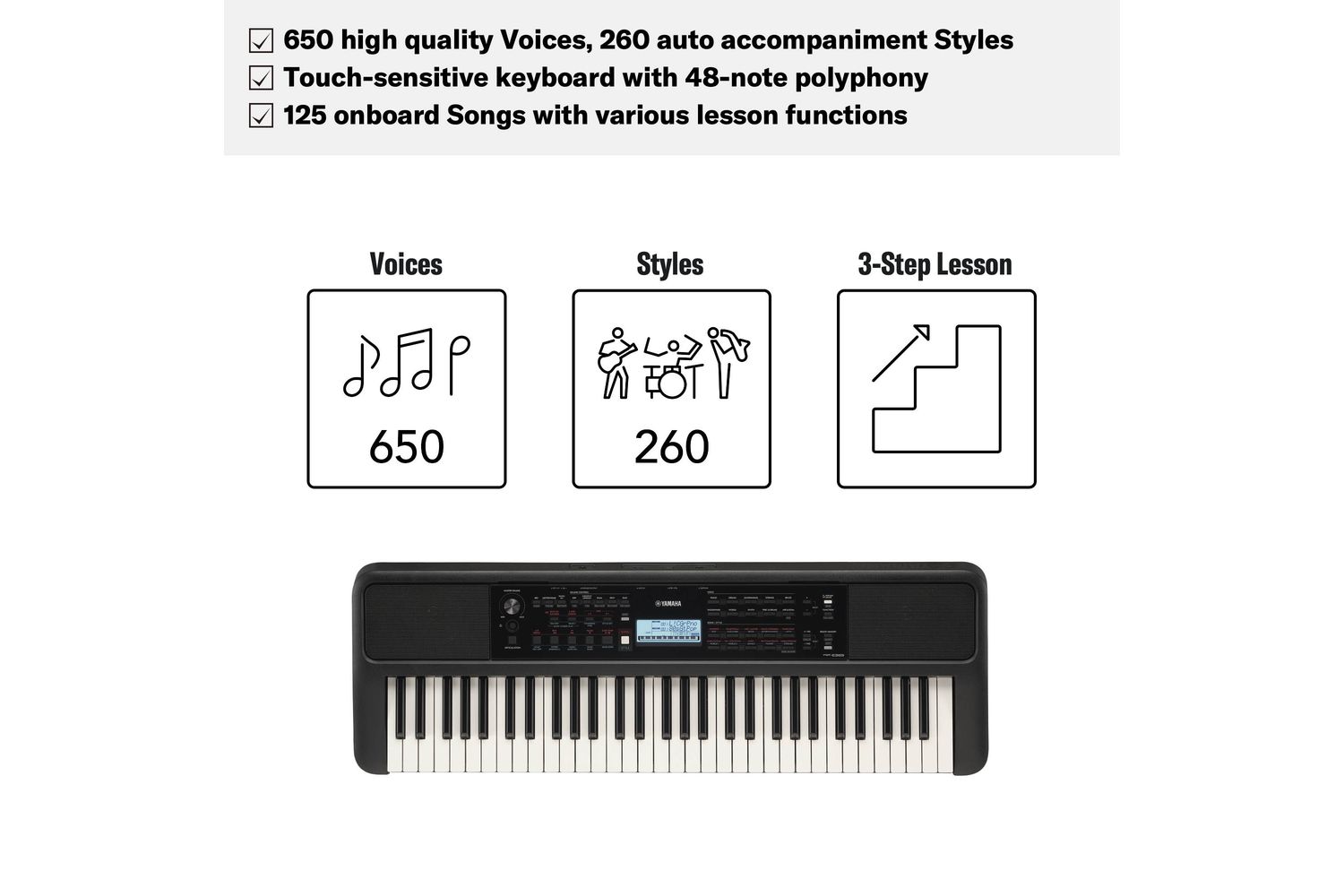 The keyboard's versatility is enhanced by 260 auto accompaniment styles that create a seamless, professionally arranged feel to any composition. You can easily create full band arrangements and explore different music genres, making each playing experience unique.