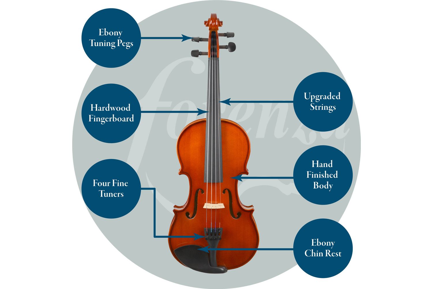 Such generous dedication to quality does not stop at aesthetics. The signature feature of Forenza Prima I is the delightful functionality of its features. It includes an ebony chin rest and matching tuning pegs that ensure crisp sound and ideal comfort. The upgraded premium student strings equipped with a protector allow for uncompromised sound production and the bow made of quality wood enhances the playing experience. It also features four fine tuners—one for each string—assuring an easy-to-tune option, and optimal sound precision—a treasure for any musician.