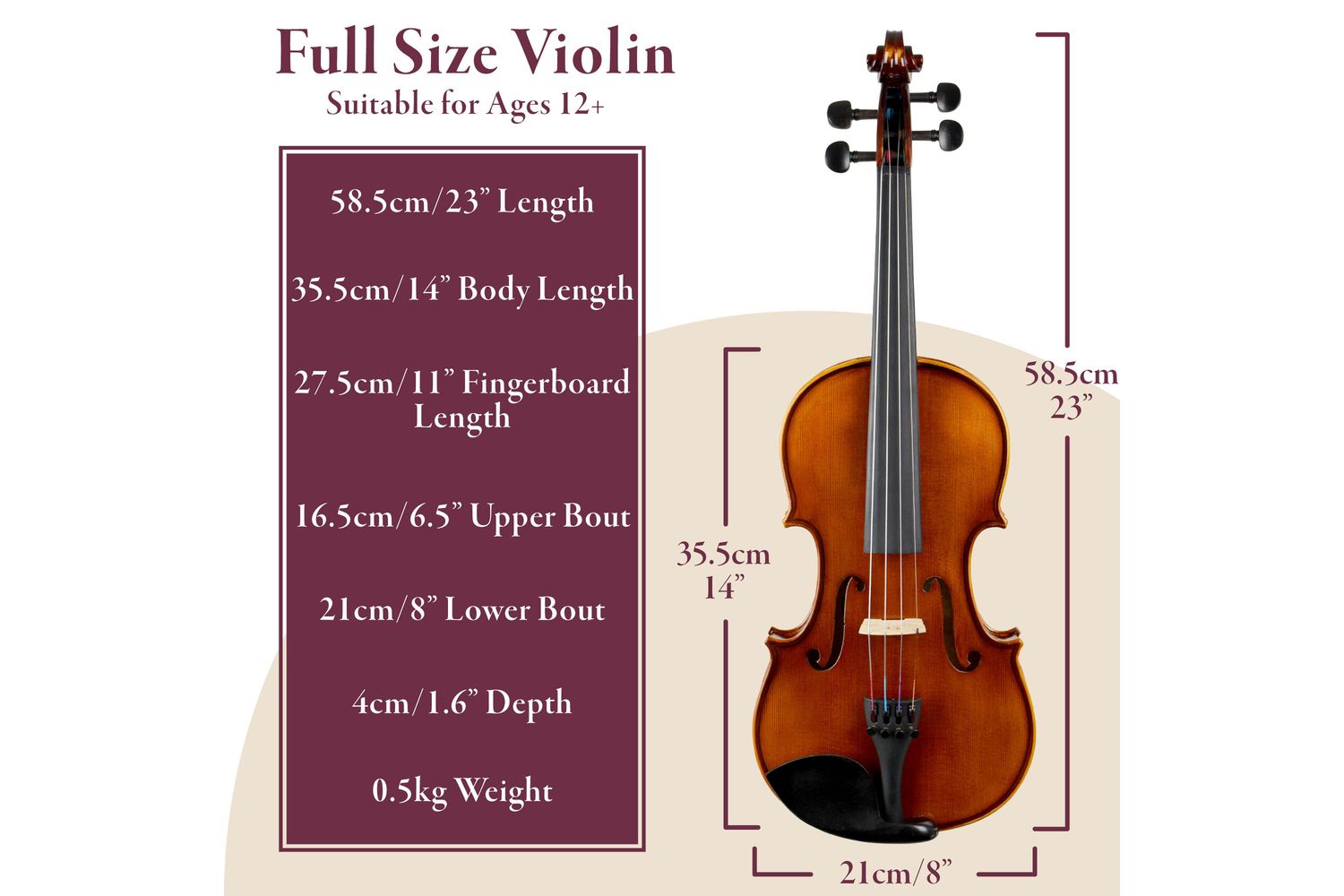 - Detailed with an ebony fingerboard, chin rest, and tuning pegs
