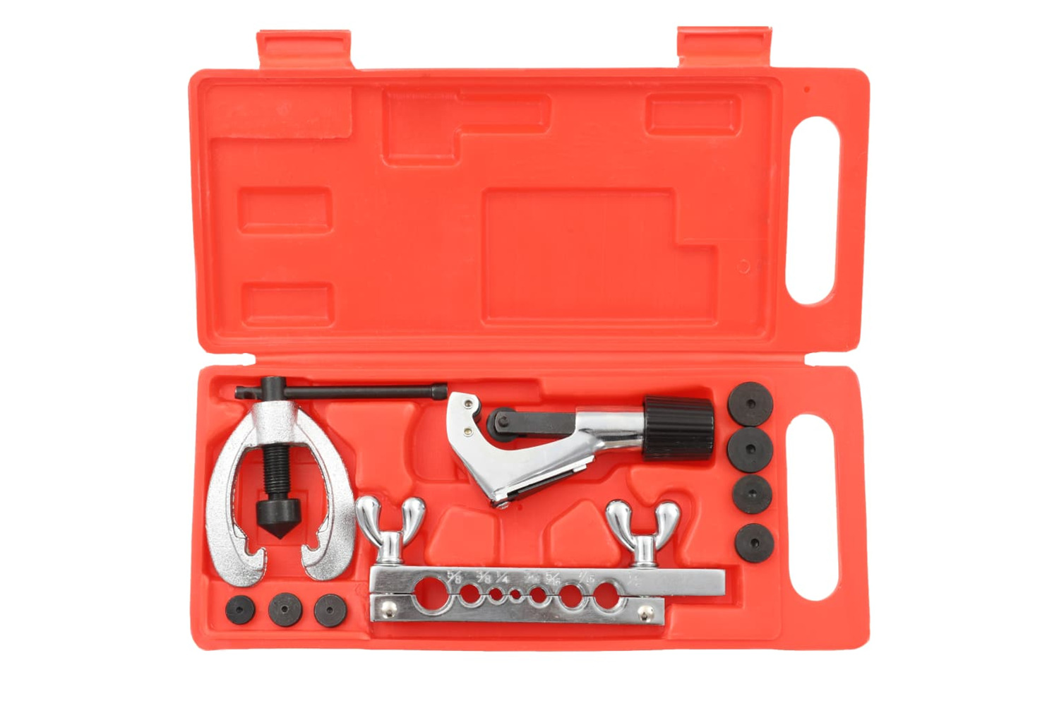 This high-quality flaring tool knit with a tube bender is an ideal choice for pipe flaring and can be used to make single or double flares on copper, brass and aluminium pipes, etc. Hardened steel chrome-finished ensures strength and durability. The flaring tool knit set comes in a sturdy red potable case for easy storage and transportation.