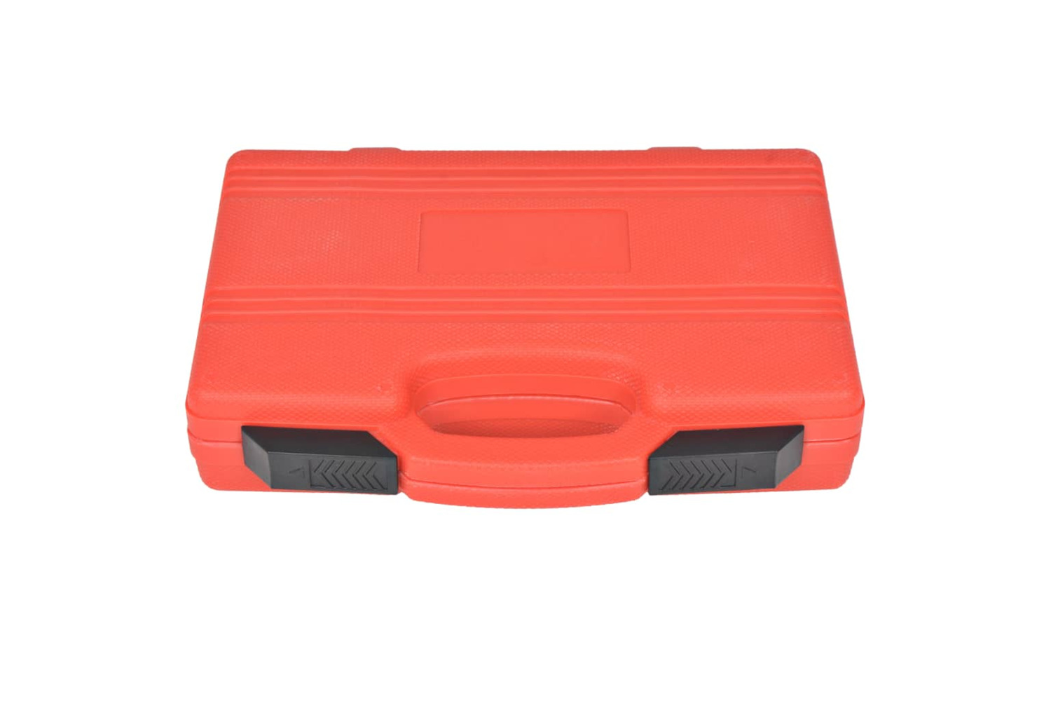 Delivery includes 1 compression tester, 1 rubber hose, 4 spark plug adapters, 1 straight pressure tube and 1 angled pressure tube. All pieces are neatly organised in a blow-moulded case.