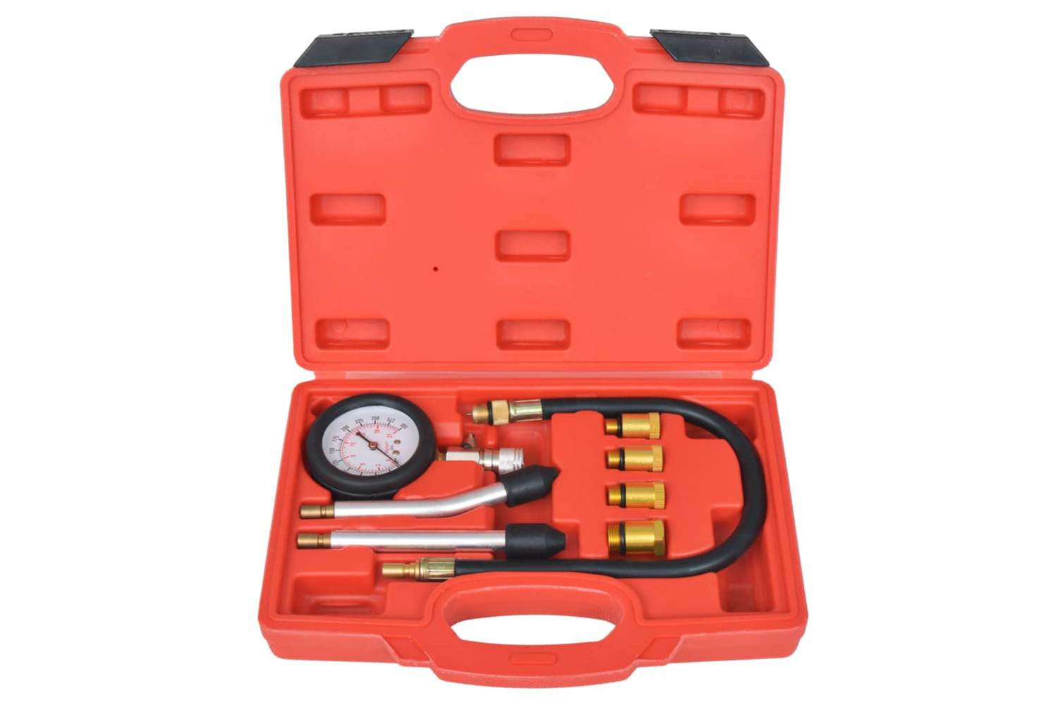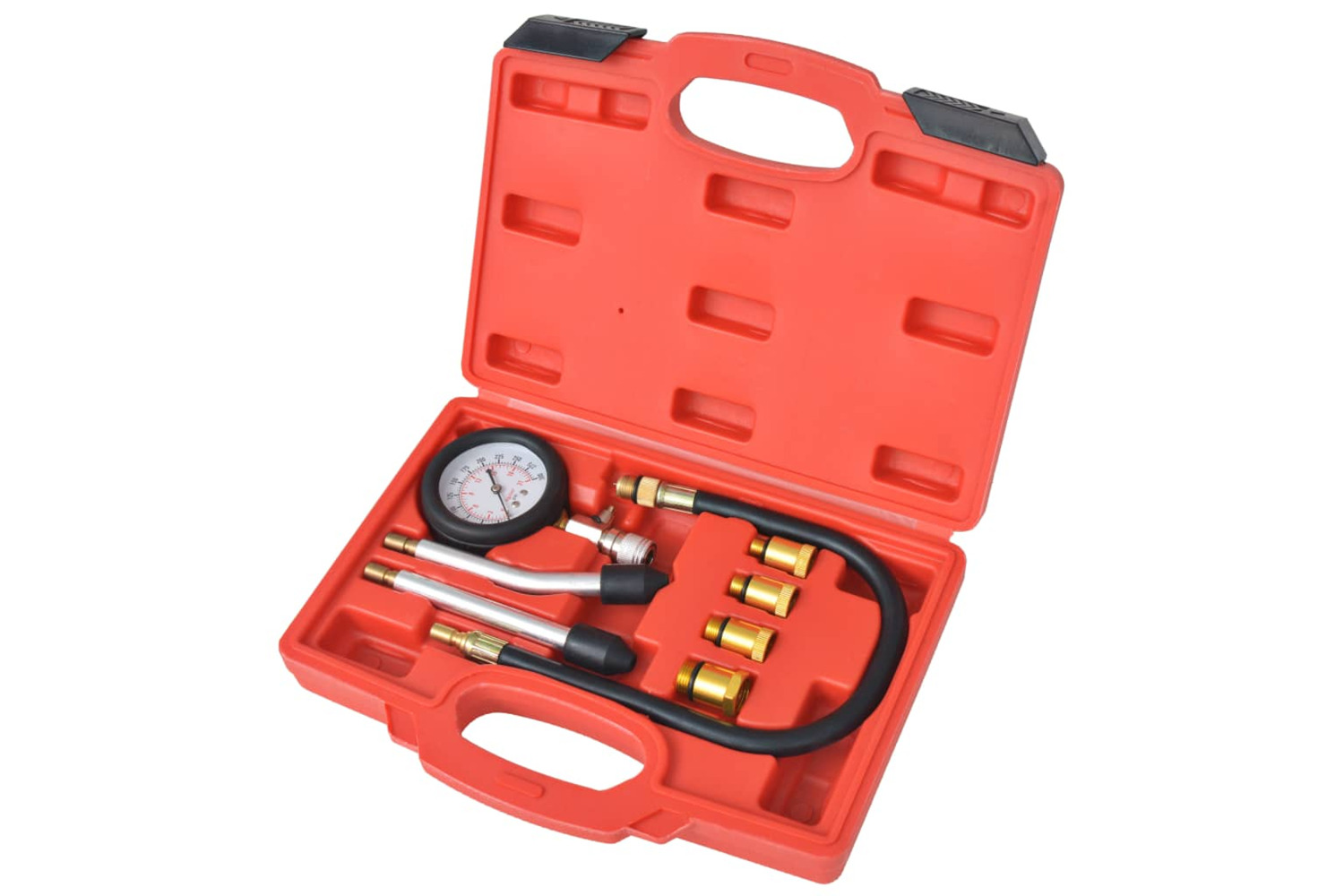 This engine compression tester kit is designed to check for internal engine failures such as bad valves, worn-out piston rings or head gaskets, or excessive carbon build-up.