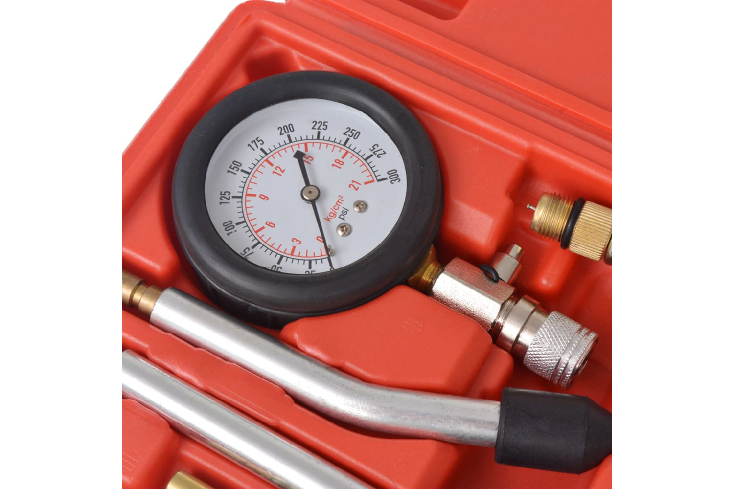 This kit is delivered with 1 rubber hose and 4 heavy-duty spark plug adapters in different sizes to fit various vehicles. The straight and angled tube connectors have a rubber cone that doesn't need to be threaded and can be used to test the compression of almost any engine. The easy-to-read gauge has a dual scale that ranges from 0-300 psi and 0-21 kg/cm².