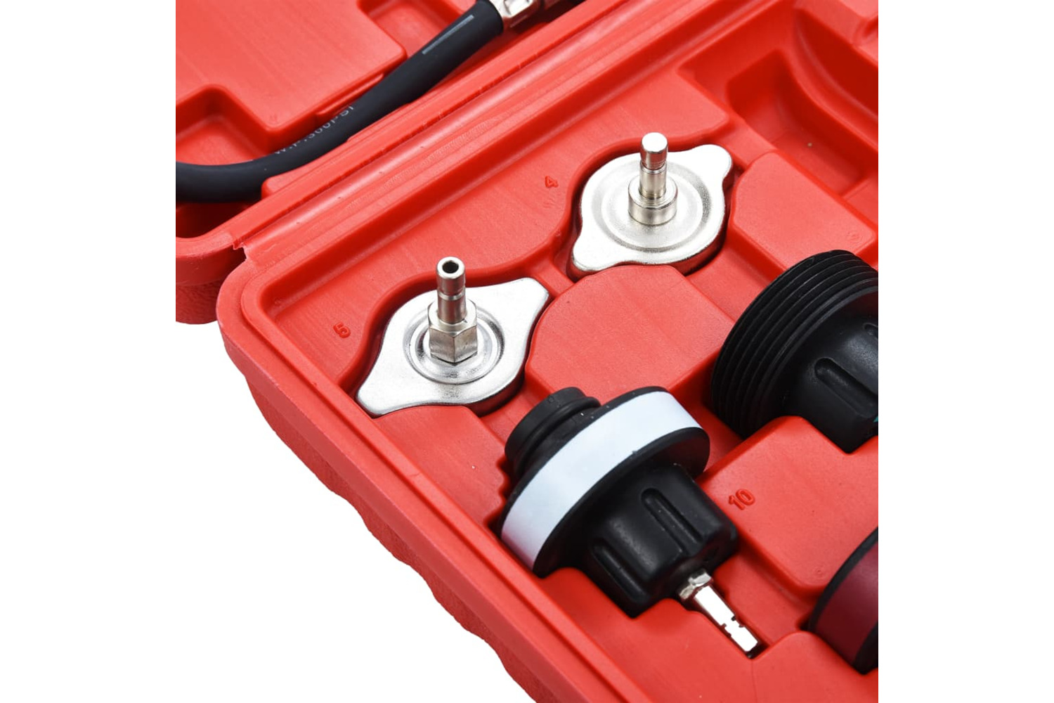 This radiator pressure tester kit will help you find internal and external leaks in your cooling system. This tool kit allows you to change the coolant and test for leaks in the vehicle's cooling system, including the radiator, heater core and radiator cap, in a simple and straight-forward manner. Made of quality material, this pressure tester is very durable. The kit is delivered in a blow-molded case for easy storage and transport.