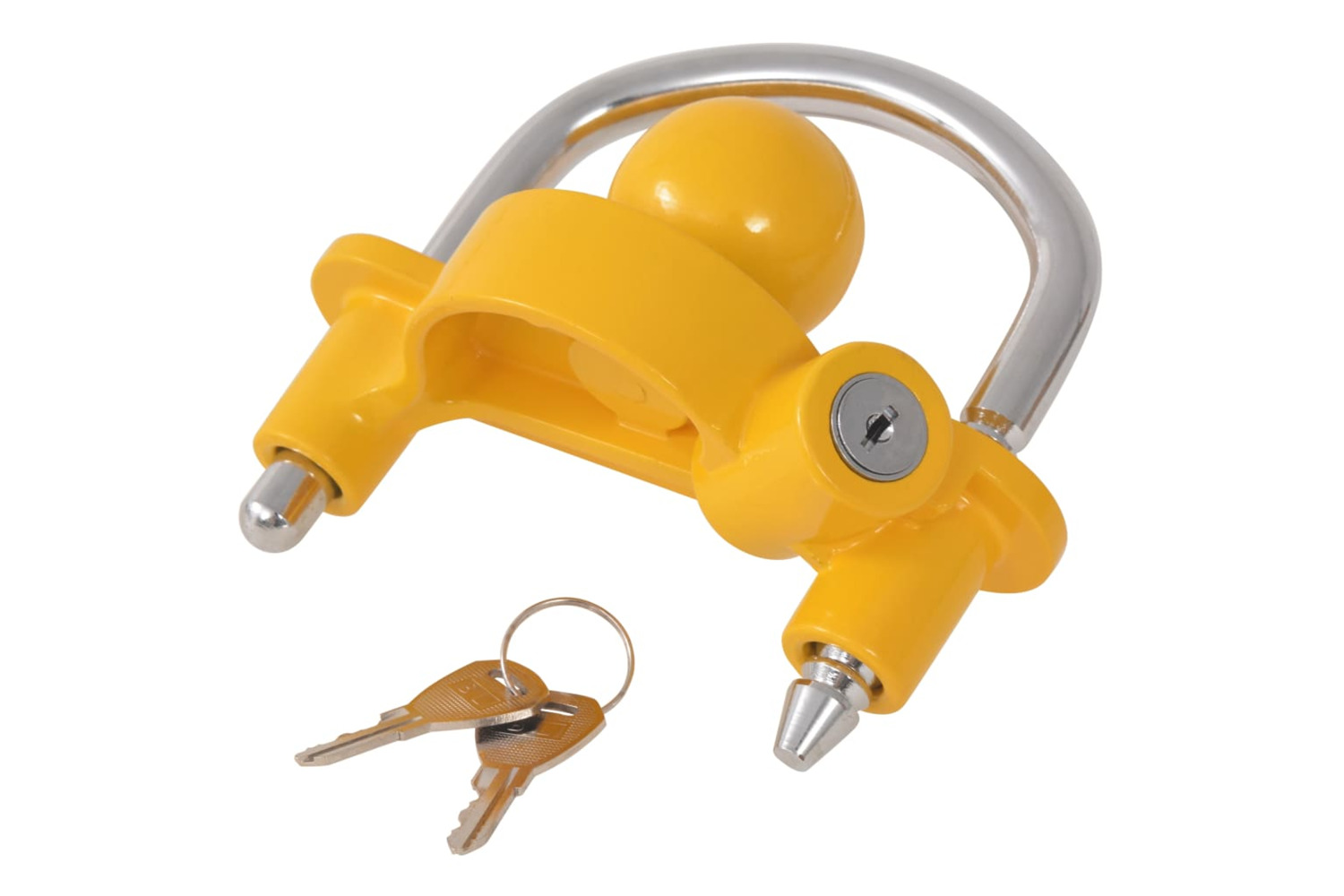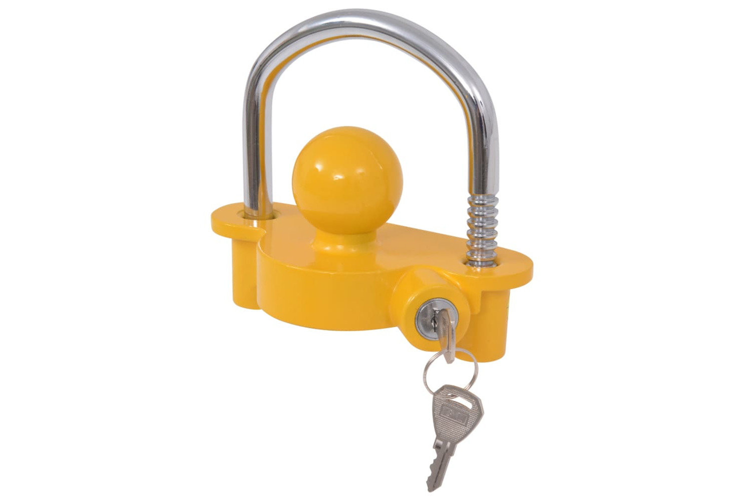 This trailer lock is made of a heavy-duty steel shackle and an aluminium alloy body that has been given a yellow powder-coated finish to prevent rust and make it weather resistant. It's quite simple to lock your trailer. Simply unlock the bar with the key and pull it up, so the ball is placed in the trailer's hitch and lock it again.