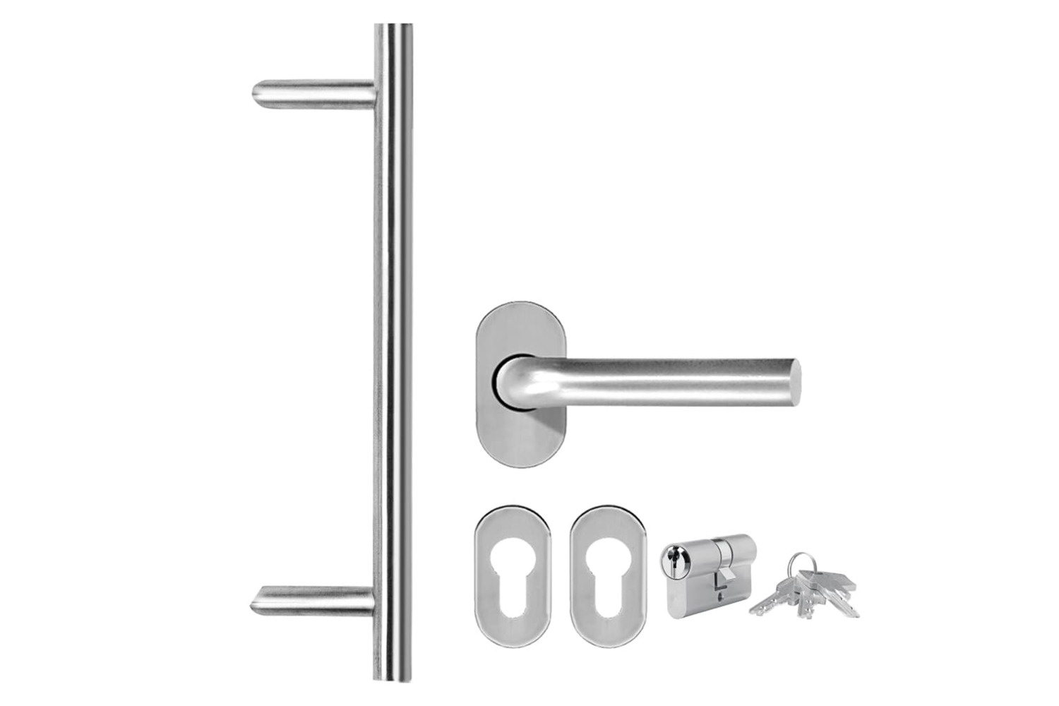 You will have a whole kit since the stainless steel pull handle and the inside handle are included, as well as the profile cylinder, keys, sealing tape and assembly set.