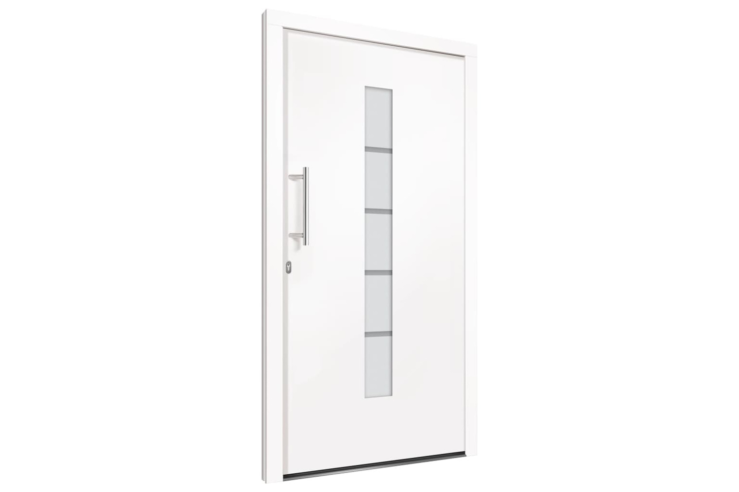 This front door is equipped with a sturdy frame and filling, aluminium threshold, adjustable hinges, 5-way safety lock hook-bolt design, insulating glazing and galvanised steel reinforcement. The entry door, made of aluminium and PVC material, is also impressive with the robust quality and high locking convenience. It comes with a whole kit including the inox push handle, the inside handle, keys, sealing tape and assembly set.