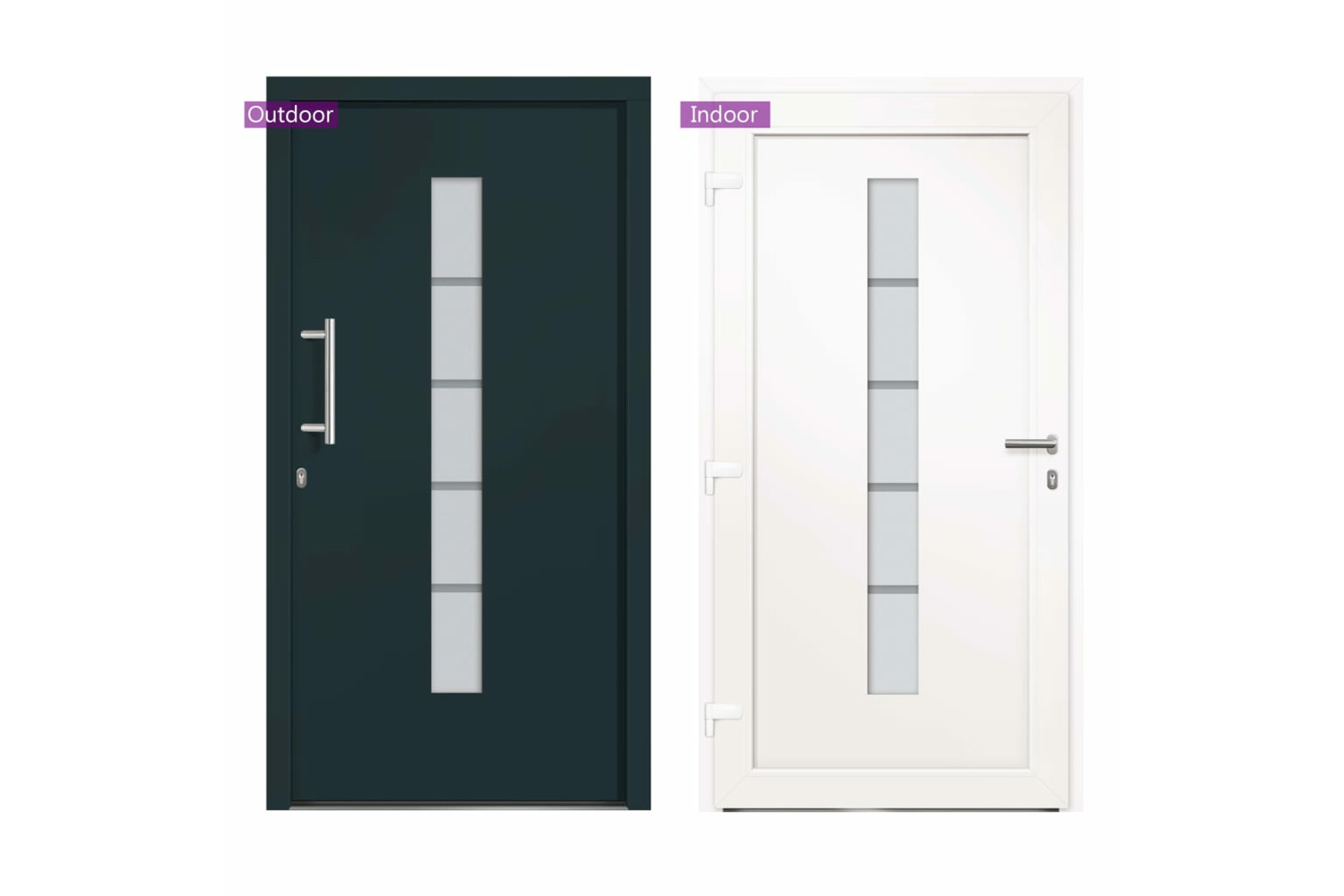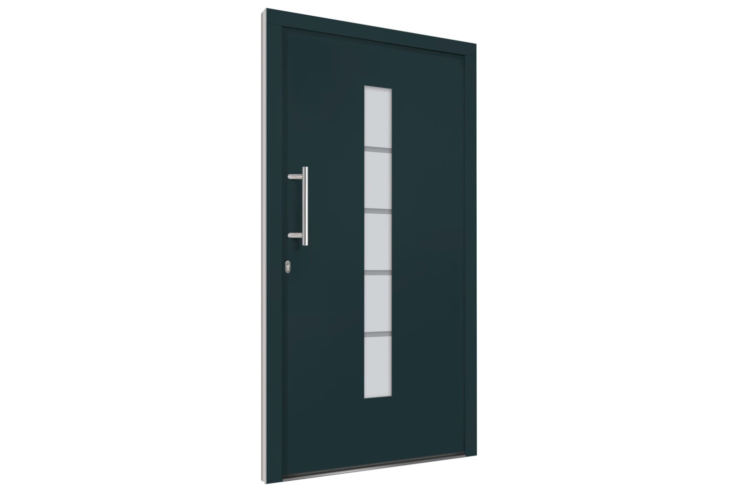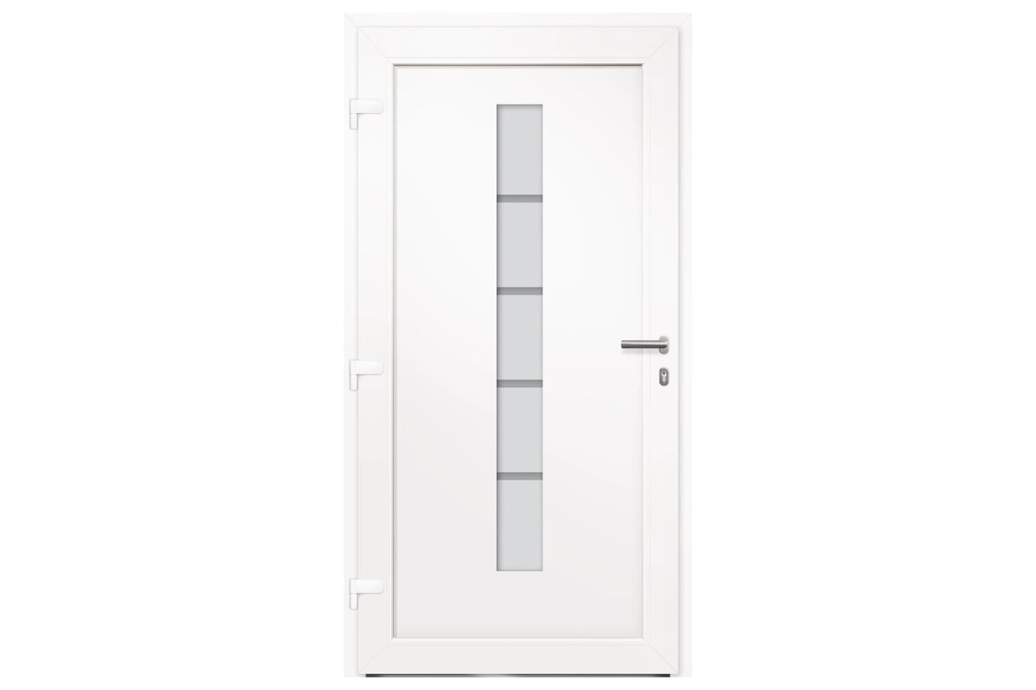 This front door is equipped with a sturdy frame and filling, aluminium threshold, adjustable hinges, 5-way safety lock hook-bolt design, insulating glazing and galvanised steel reinforcement. The PVC-aluminium entry door is also impressive with the robust quality and high locking convenience. It comes with a whole kit including the inox push handle, the inside handle, keys, sealing tape and assembly set.