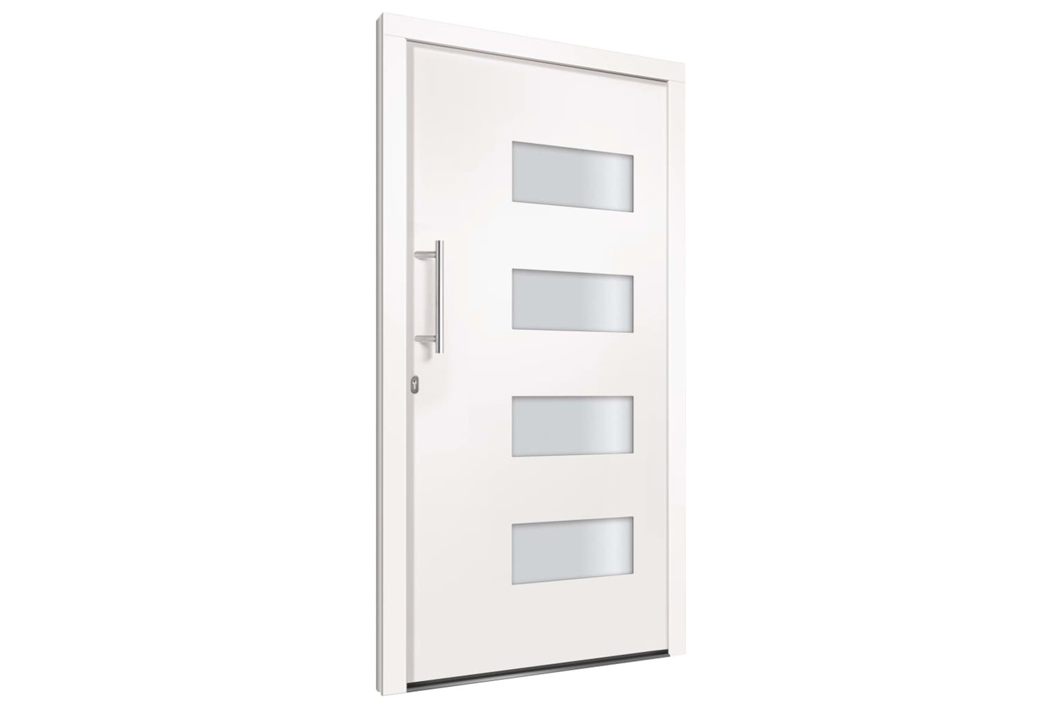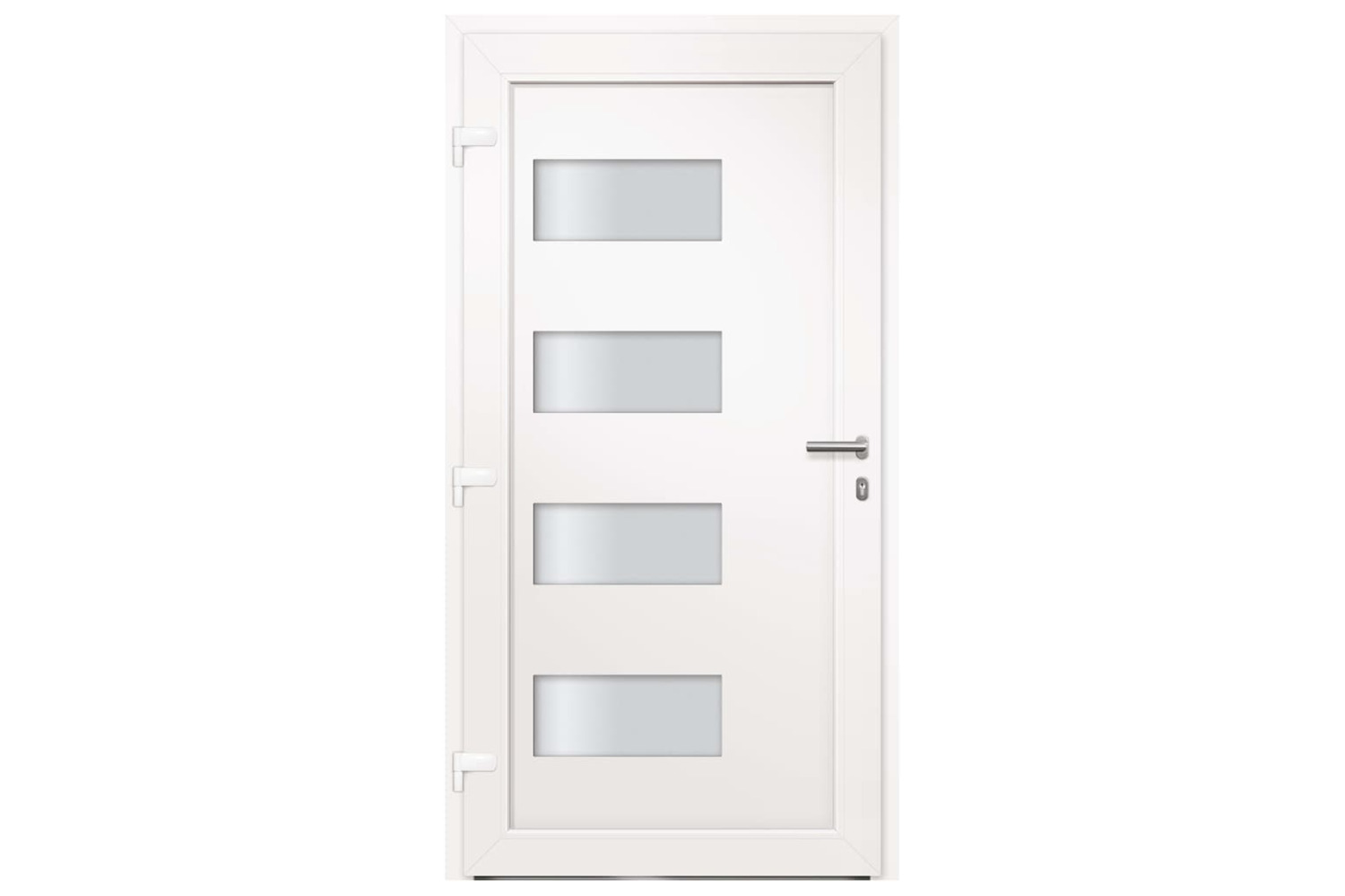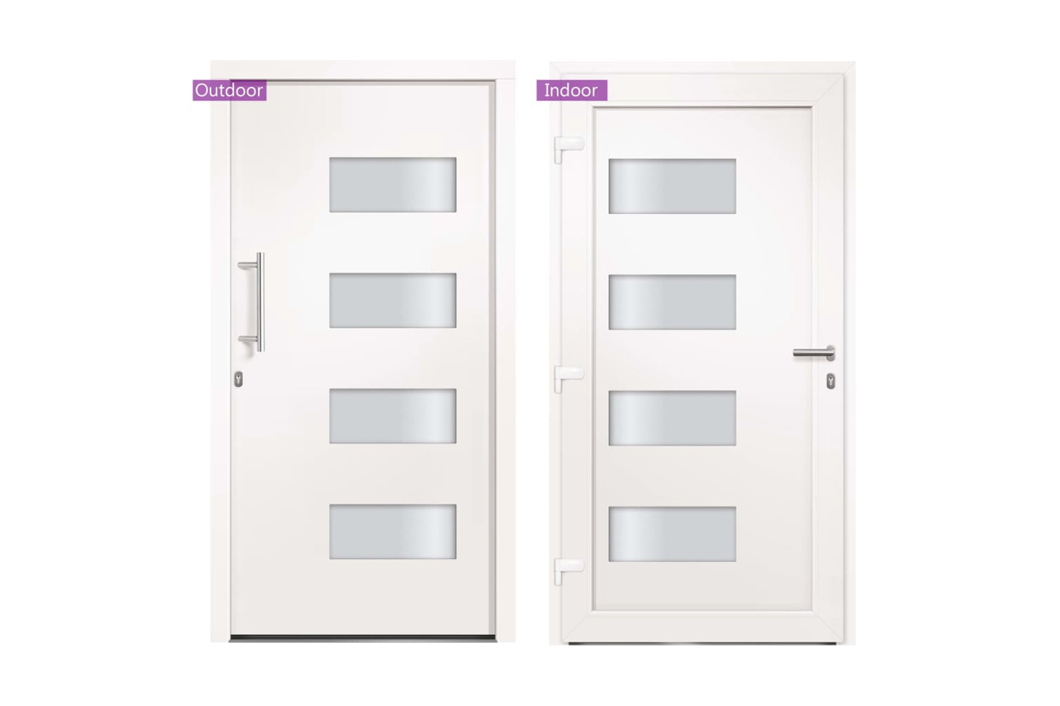 This front door is equipped with a sturdy frame and filling, aluminium threshold, adjustable hinges, 5-way safety lock hook-bolt design, insulating glazing and galvanised steel reinforcement. The entry door, made of aluminium and PVC material, is also impressive with the robust quality and high locking convenience. It comes with a whole kit including the inox push handle, the inside handle, keys, sealing tape and assembly set.