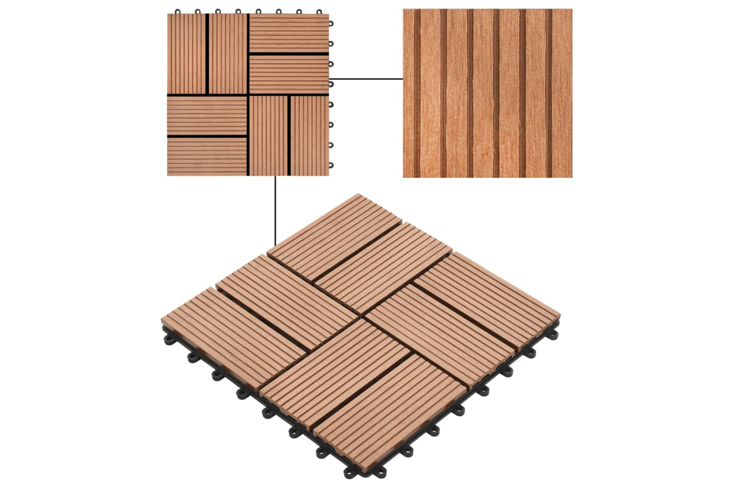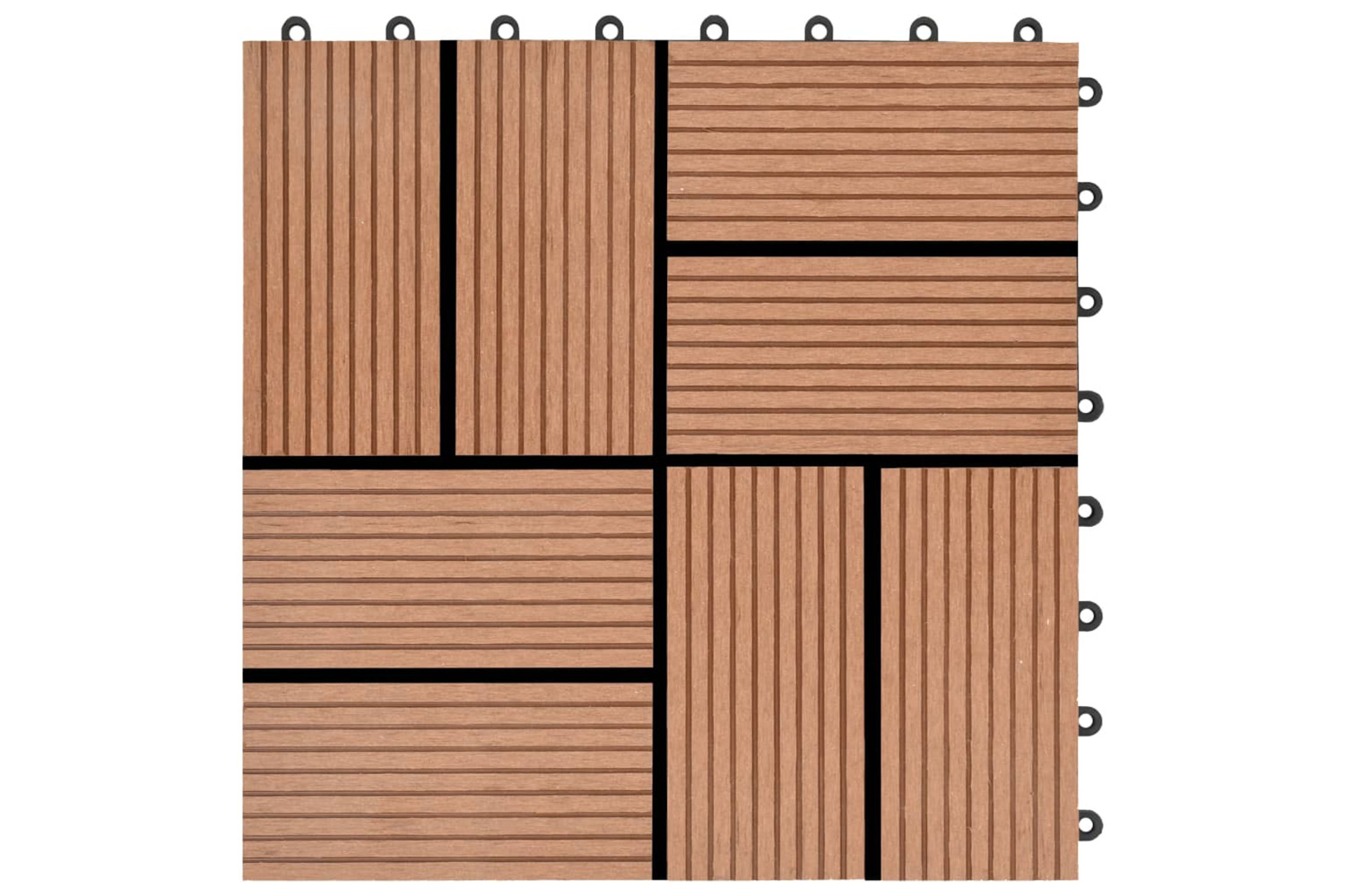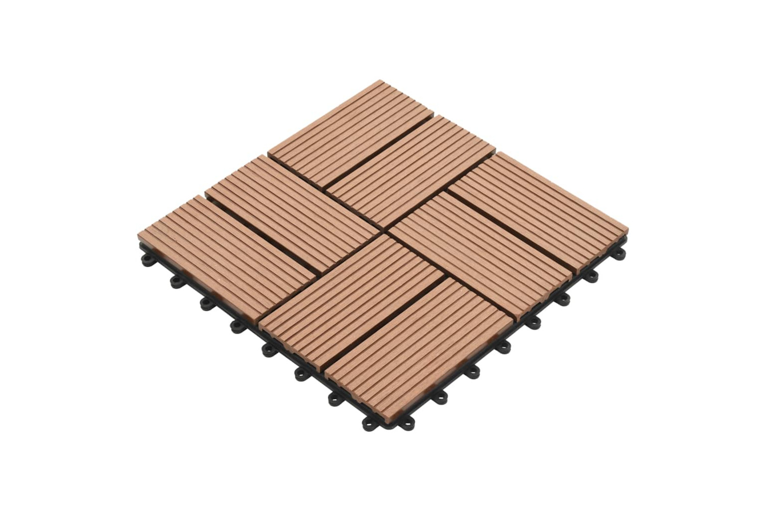 This WPC decking tile set, with an individual tile size of 30 x 30 cm, consists of 22 pieces and covers a total surface area of 2 square metres. It will be perfect for patios, balconies, bathrooms, or your pool or spa area.