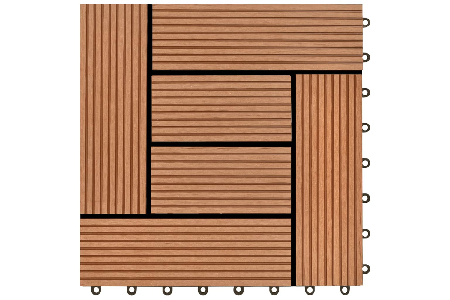 This WPC decking tile set, with an individual tile size of 30 x 30 cm, consists of 11 pieces, covering a surface area of 1 square meter. It will be perfect for patios, balconies, bathrooms, or your pool or spa area.