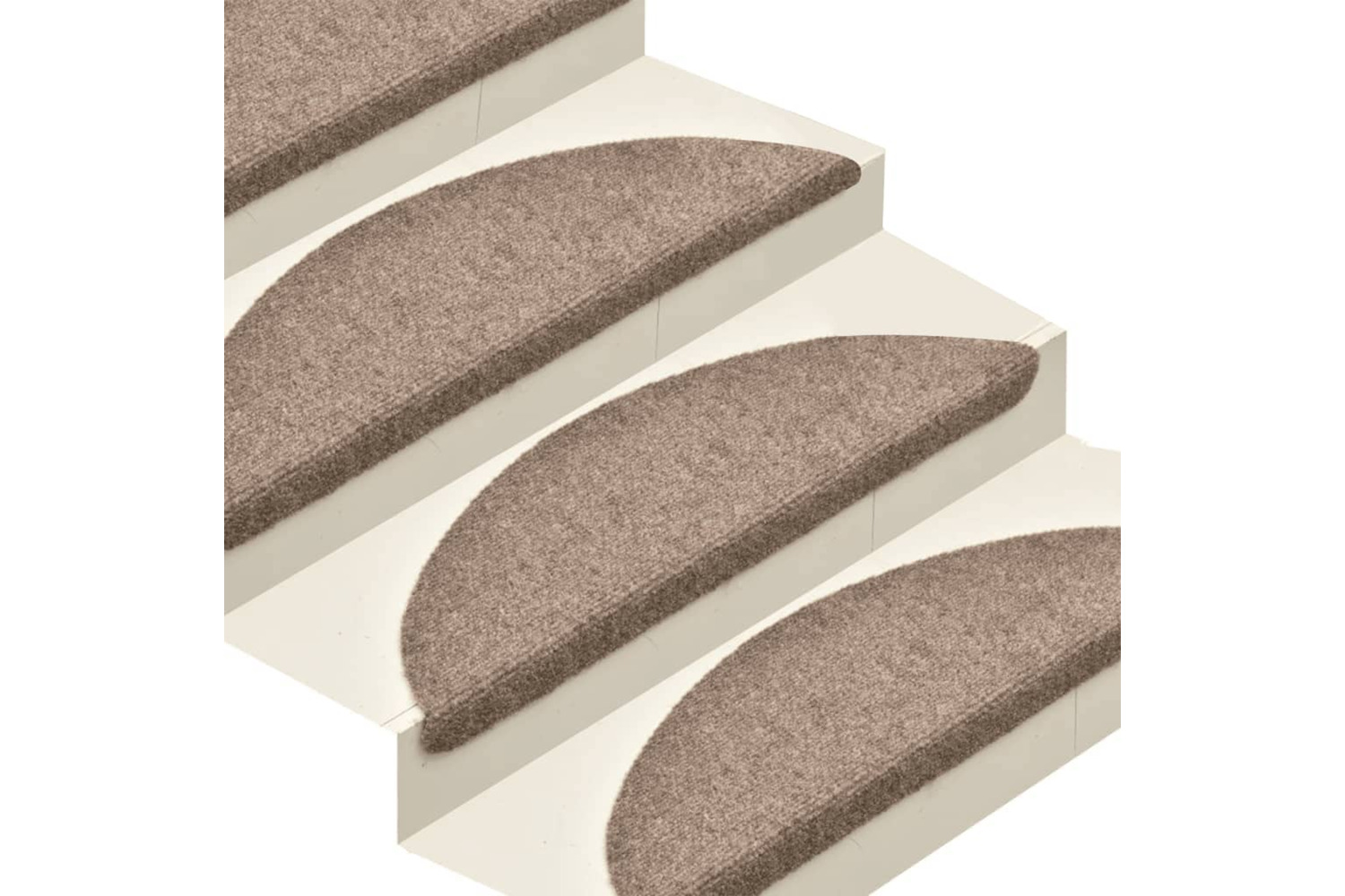 These stair rugs are made of strong needle-punched fabric, making them sound dampening, non-slip and comfortable. The stair-step carpets are also washable. They are folded to protect both the top and the front of the stairs. The adhesive dots on the back allow these mats to be attached to the stairs easily and quickly.
