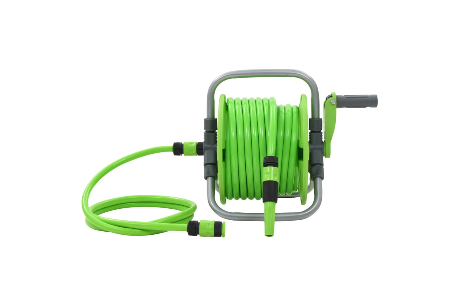 This hose reel comes pre-loaded with 20-metre garden water hose while the connector hose has a length of 2 metre. The water flow can be adjusted by simply rotating the included spray nozzle. The hose is made of high-quality PVC which is very durable. The convenient handle makes it easy to lift or transport the hose reel.