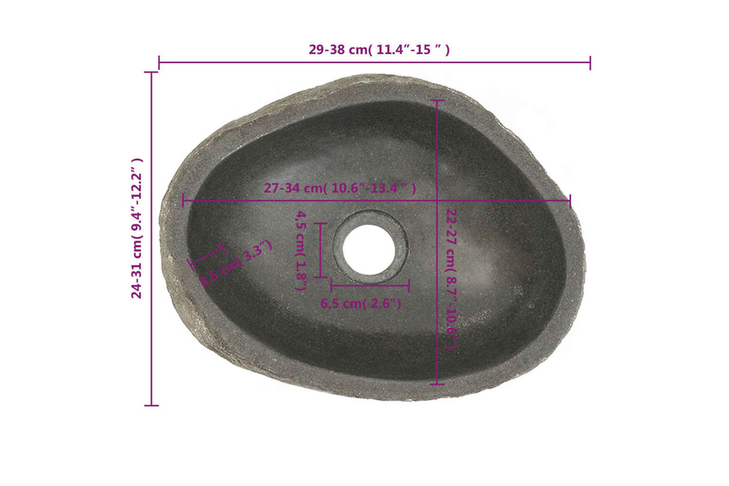 Note: Riverstone is a natural product and colour and shape differences might therefore occur, please have a look at the product photos for examples. The real product might be lighter or darker than in the photos and sometimes there might be a mix of colours in the product. In case of ordering multiple sinks, it cannot be guaranteed that size, shape and color will be the same.
