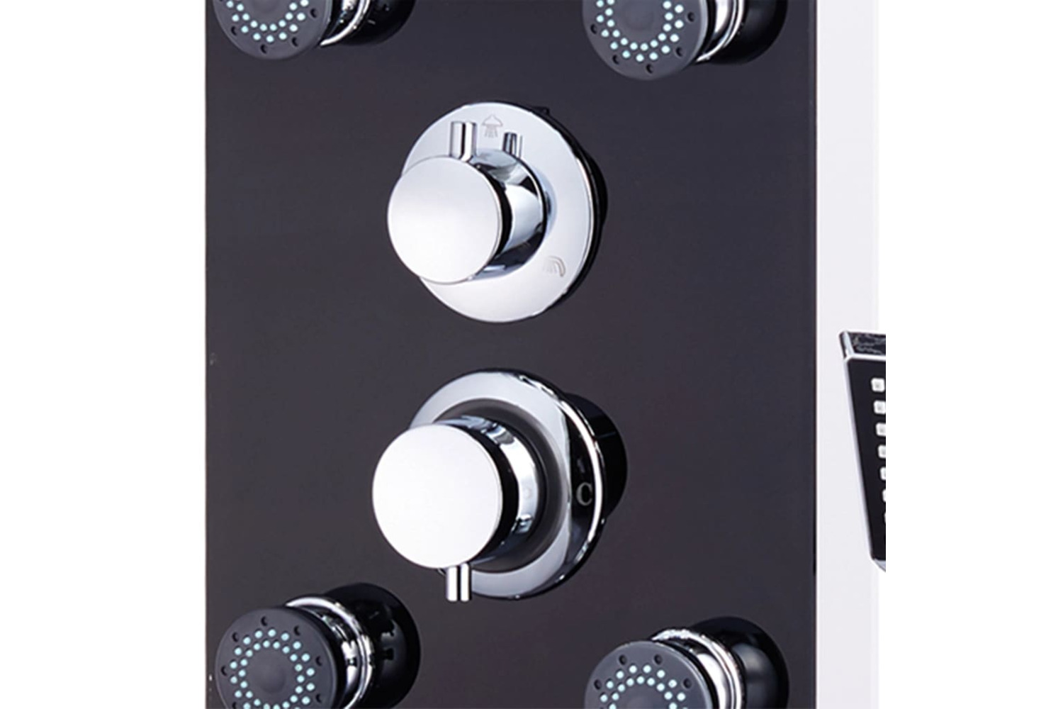 - Chrome-plated rain showerhead, massage jets, handheld showerhead and knobs