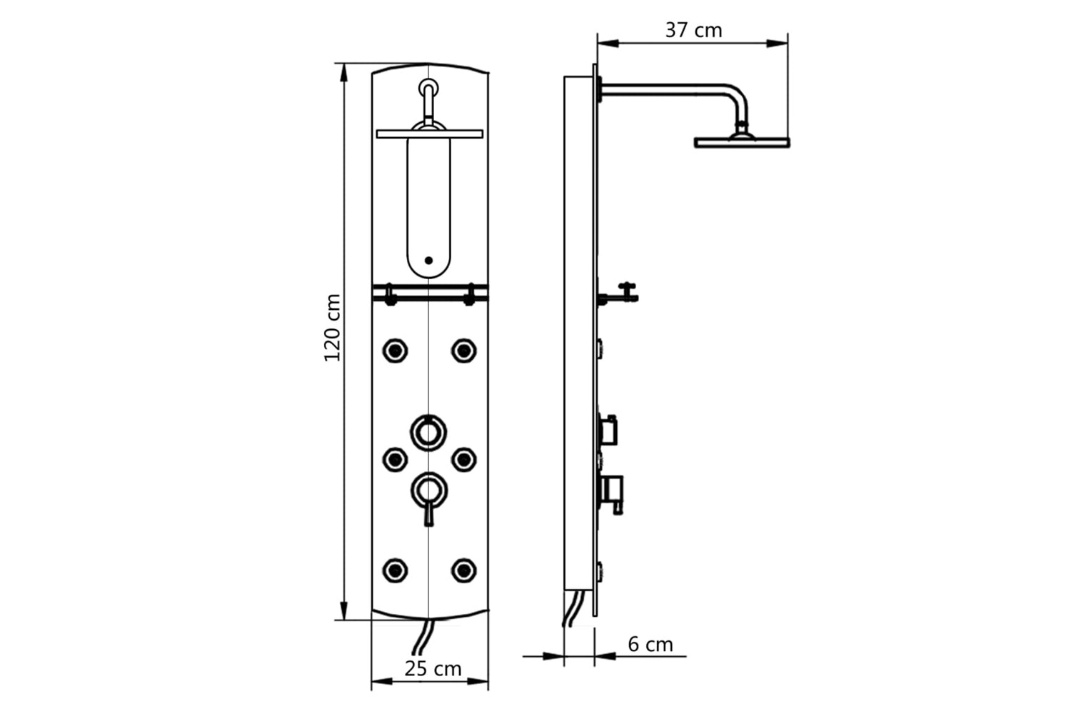 - Functions: Rain shower, 6 body massage jets, handheld shower