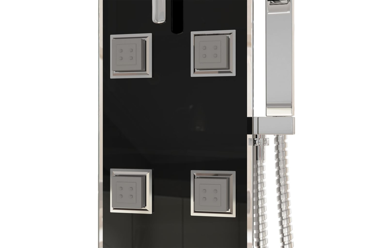 - Chrome-plated rain showerhead, massage jets, handheld showerhead and knobs