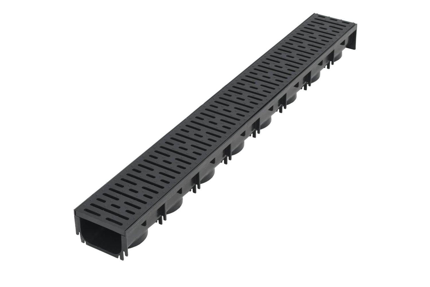This complete set consists of 4 drainage channels (each with a plastic grate) and 8 end caps. It presents a perfect solution for collecting and removing excess water from driveways, patios and any other outdoor areas.