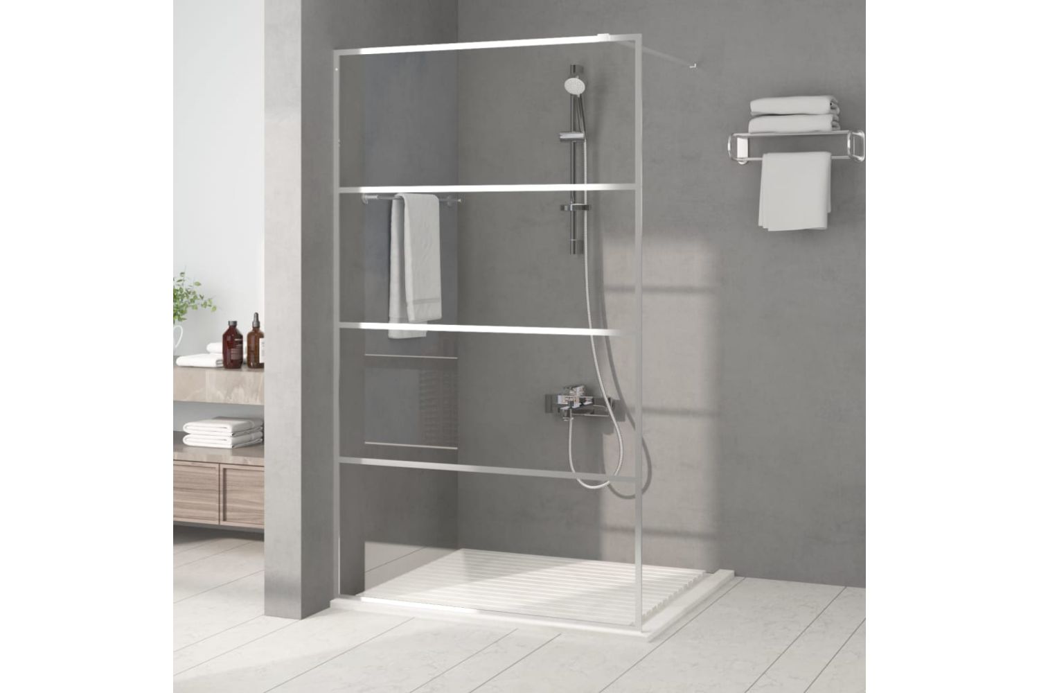 Bring a fresh appearance of aesthetics to your bathroom with this modern walk-in shower wall with ESG glass!