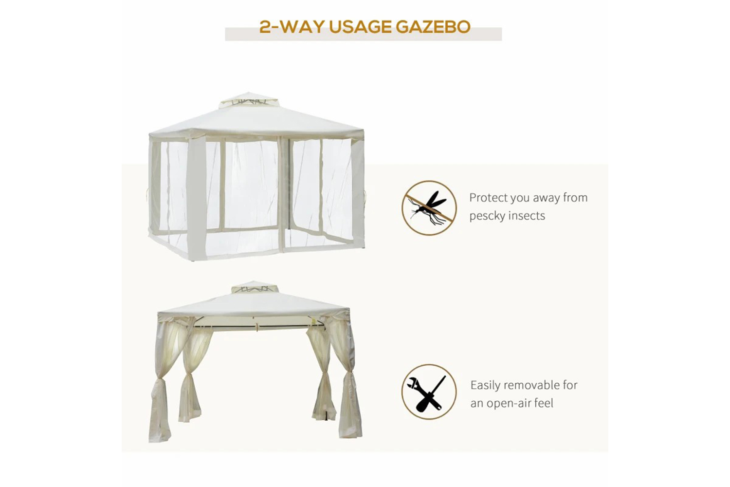 The stylish metal gazebo tent by Outsunny will turn your yard into a sophisticated and functional focal point with the stylish appearance and considerate design. The canopy top provides a perfect protection, blocking the sun's harmful UV rays while allowing sunlight to shine through. Enclosed netting provide full protection to your outdoor livings. You and your guests are free to relax and rest under the cool shaded canopy cover. Life is meant to be enjoyed outdoors. Get out and get Outsunny!