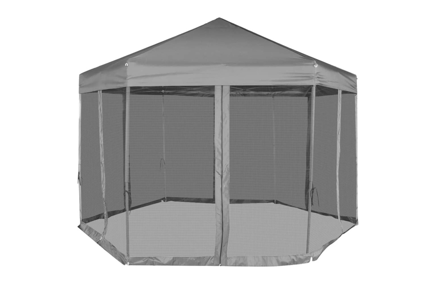 Thanks to the heavy-duty, powder-coated steel frame and solid hexagonal construction, this pop-up tent is extremely sturdy and durable. The roof is made of polyester fabric with a PA coating, and is water resistant. The 6 included mesh side walls can not only be completely closed with double zips, but also be fastened to the posts with ropes (included in delivery) for easy entry as well as air ventilation.