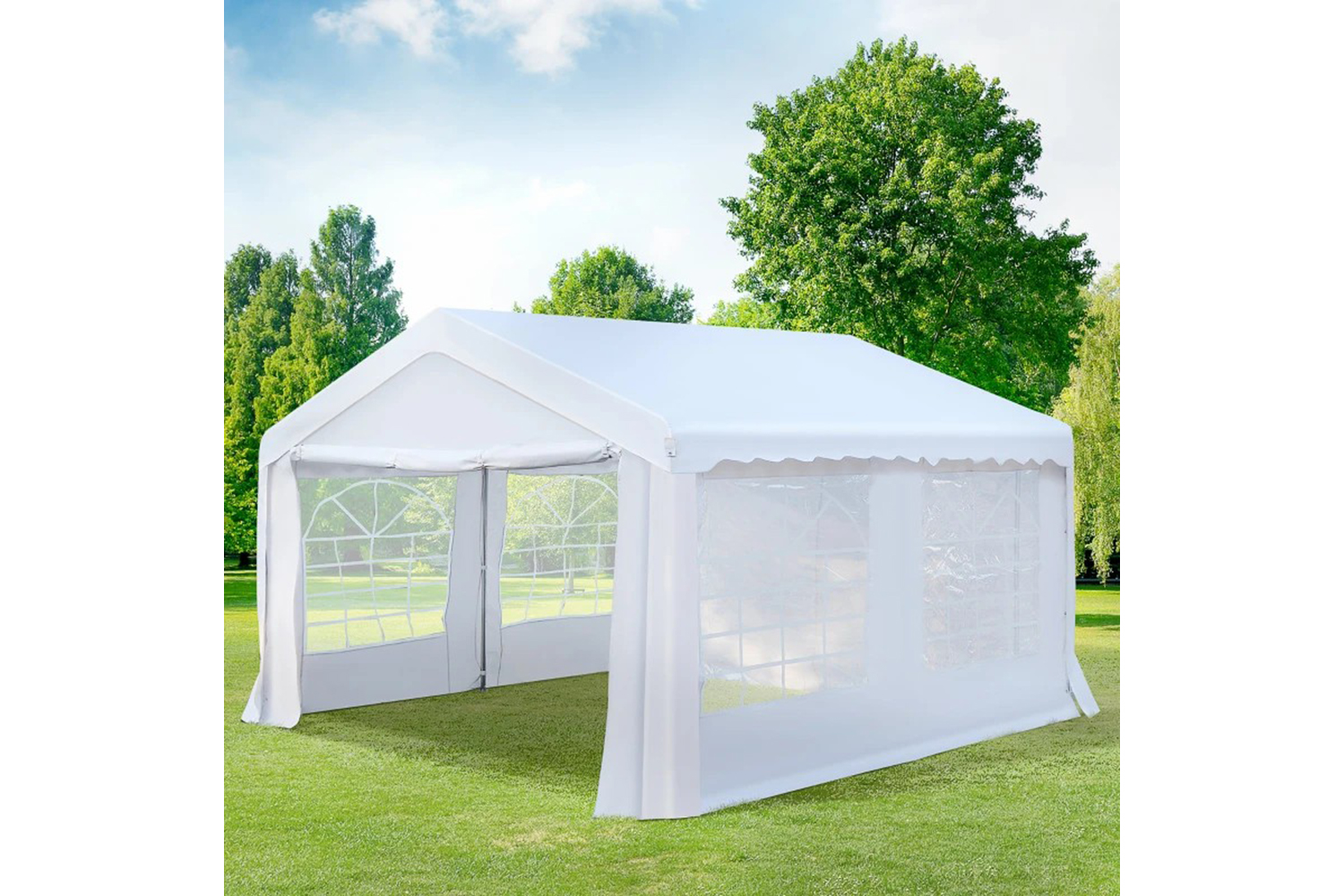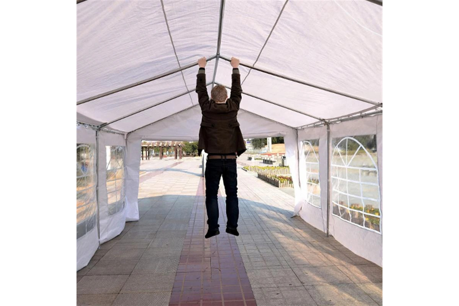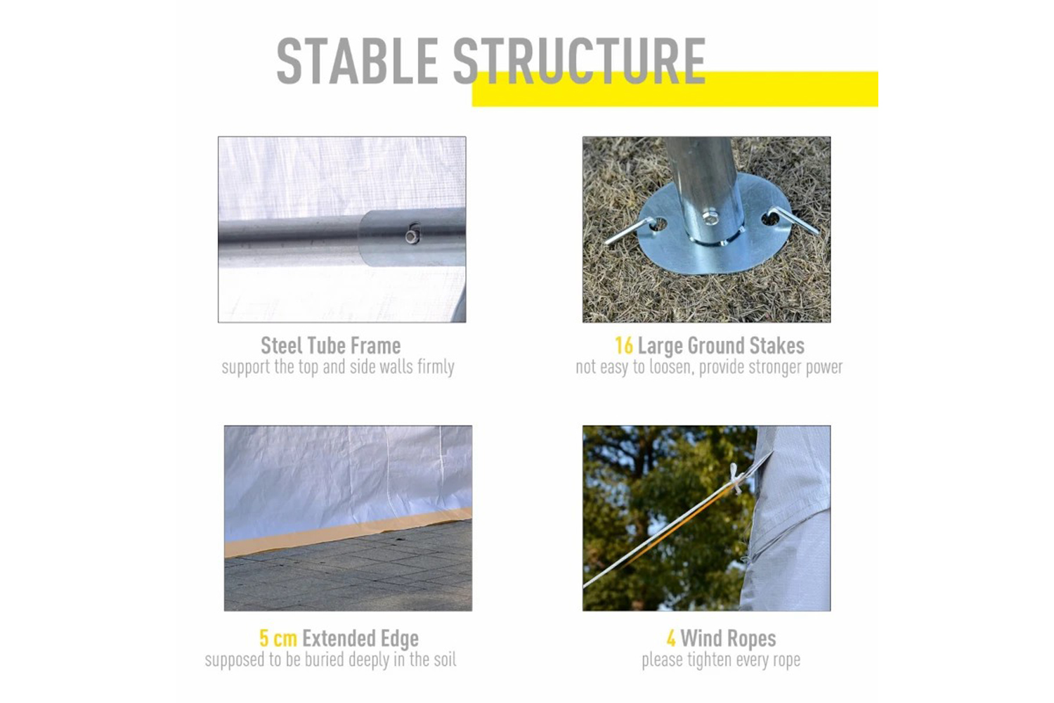 This is a great product and ideal for occasions which require minimal protection. It incorporates a heavy duty steel frame. Ideal for commercial or recreational use, car, boat storage, parties, weddings, backyard events, etc.