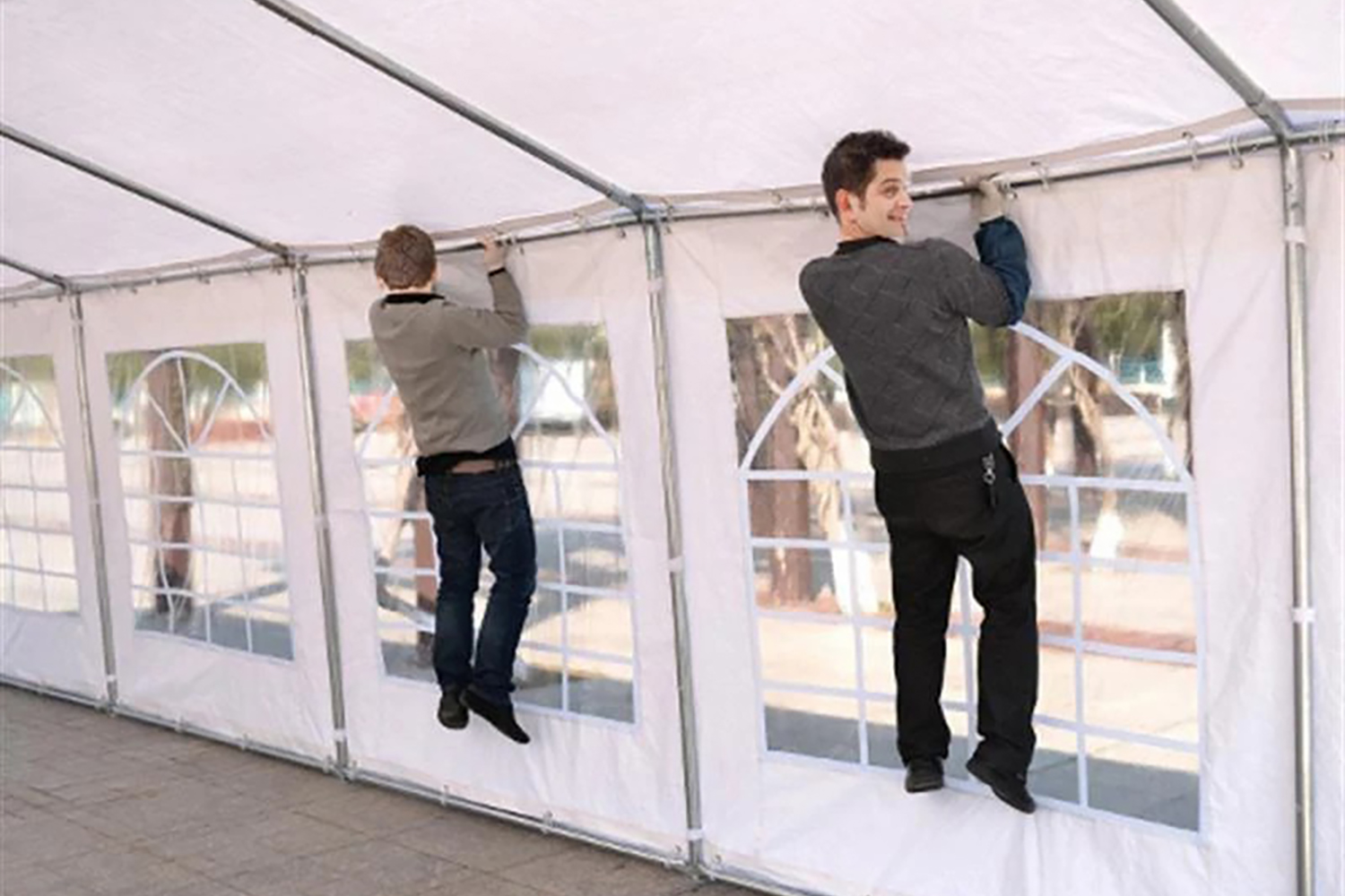 - This party tent is perfect for any outdoor entertaining, it can be easily secured to the ground for a more permanent feature and dismantled when not required. Complete with polyester curtains and tiebacks. Roof canopy has heavy-duty shower proof PVC backing, can be secured to the ground