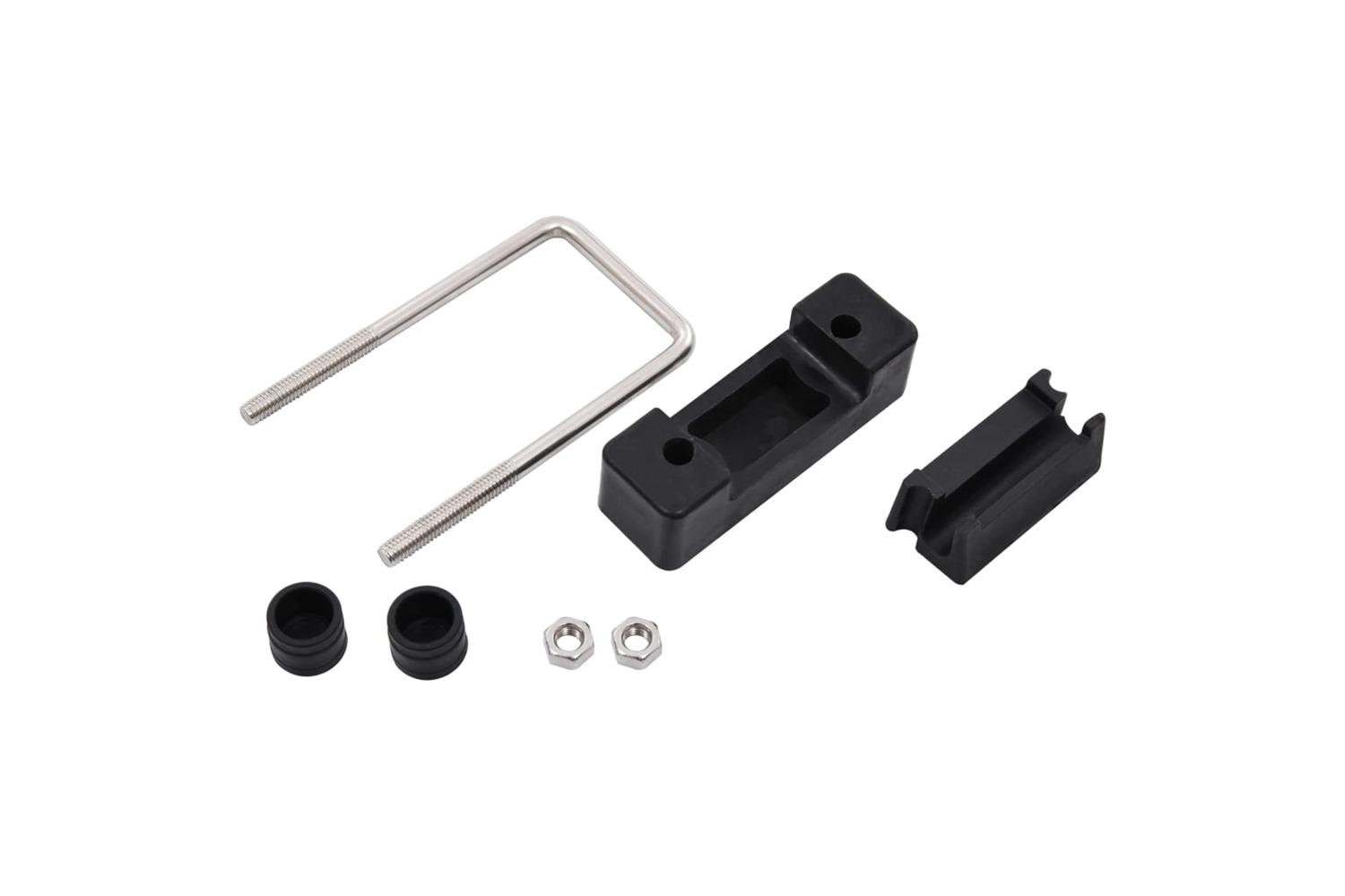 Made of high quality stainless steel and plastic, the U hanger connector is rust proof and can ensure years of reliable use. Delivery includes 25 sets in one box and each set comes with 1 U-bracket, 2 spacers, 1 counter plate, 2 nuts and 1 cap.