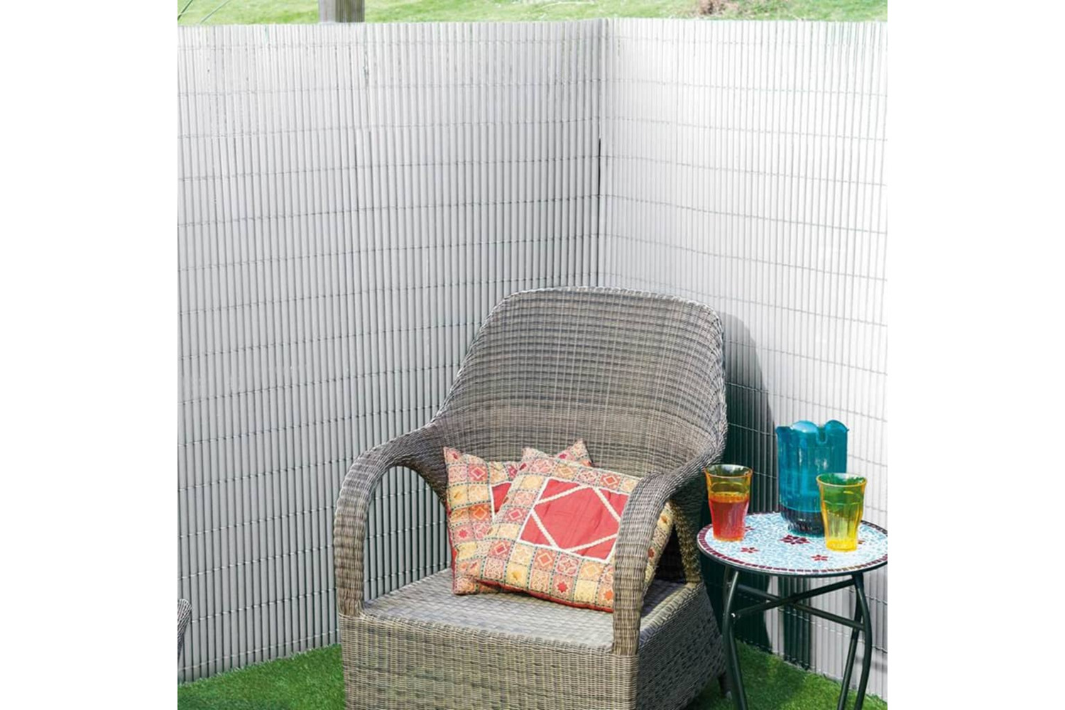 This privacy screen is made of PVC with a UV-resistant coating and it can be fixed against an existing fence. The half-oval slats are held together with nylon thread.