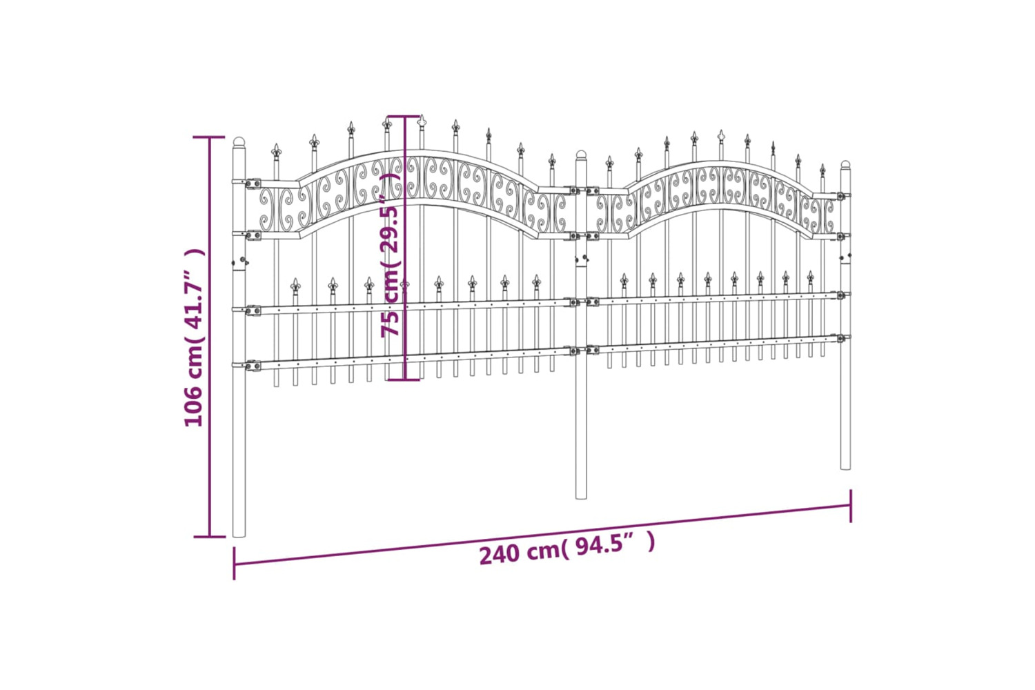 - High-security design: The metal fence provides a high degree of security with its elegant, arched top design and strong horizontal braces to reinforce the frame while forming a stunning entryway to your property.