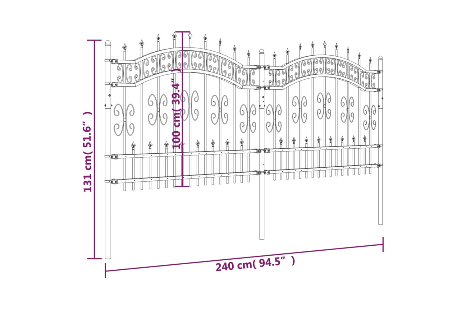 - High-security design: The metal fence provides a high degree of security with its elegant, arched top design and strong horizontal braces to reinforce the frame while forming a stunning entryway to your property.