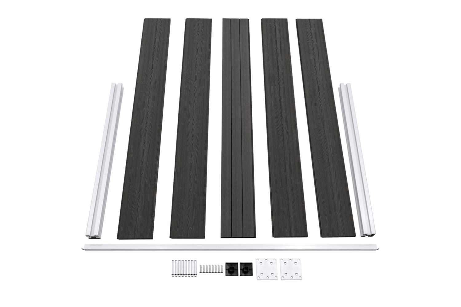 Delivery includes 9 WPC boards, 2 posts, 2 steel bases and 1 aluminium bar.