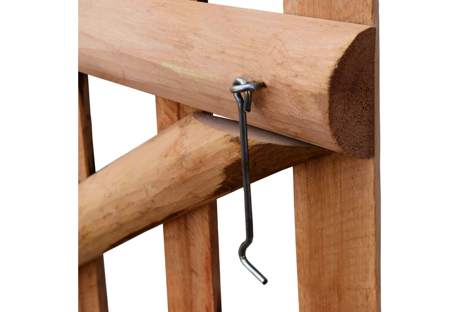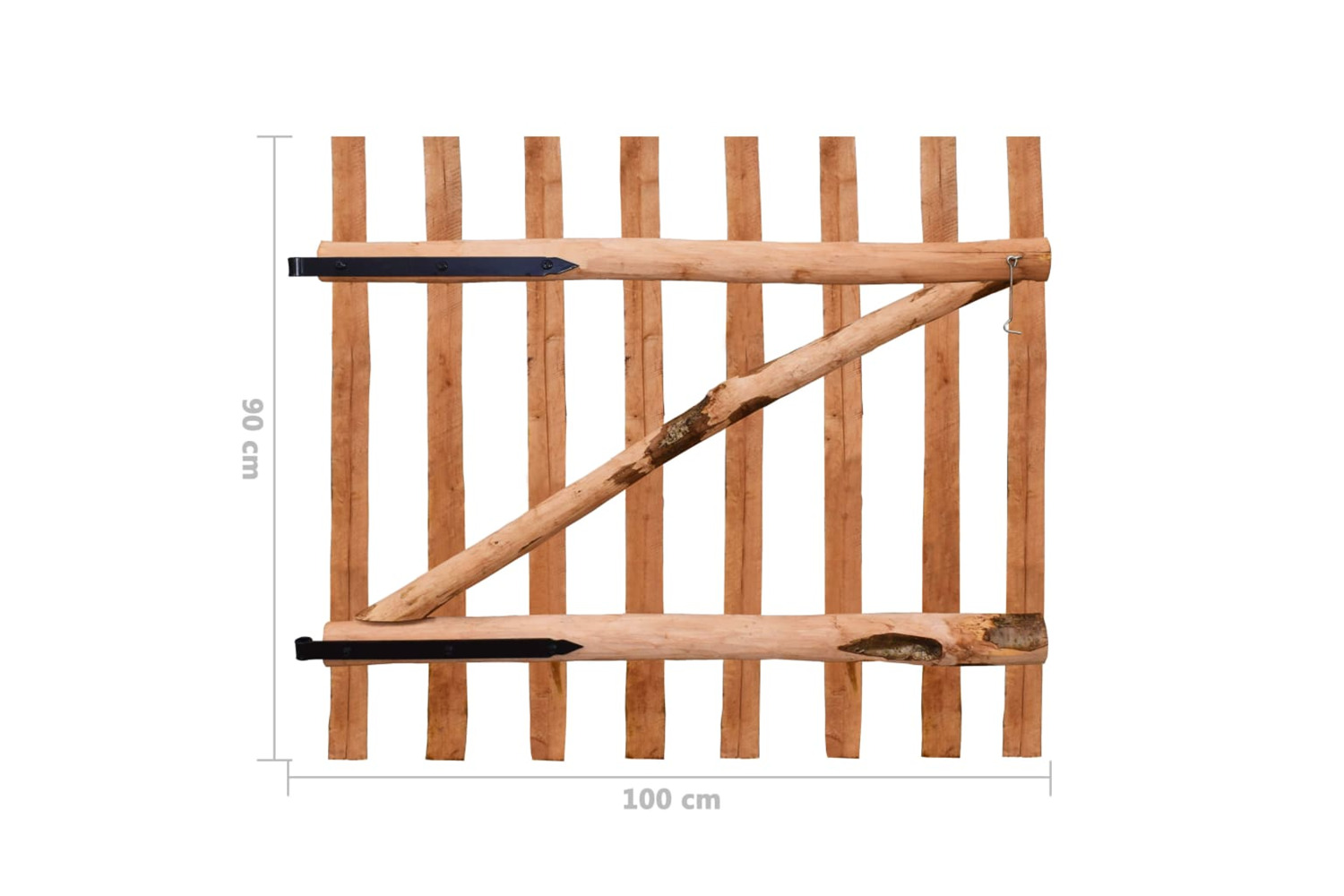 The strong fence gate is made up of vertical pickets and horizontal and diagonal crosspieces, which makes it sturdy and durable. The garden gate is delivered with metal hinges, screws and a cabin hook.
