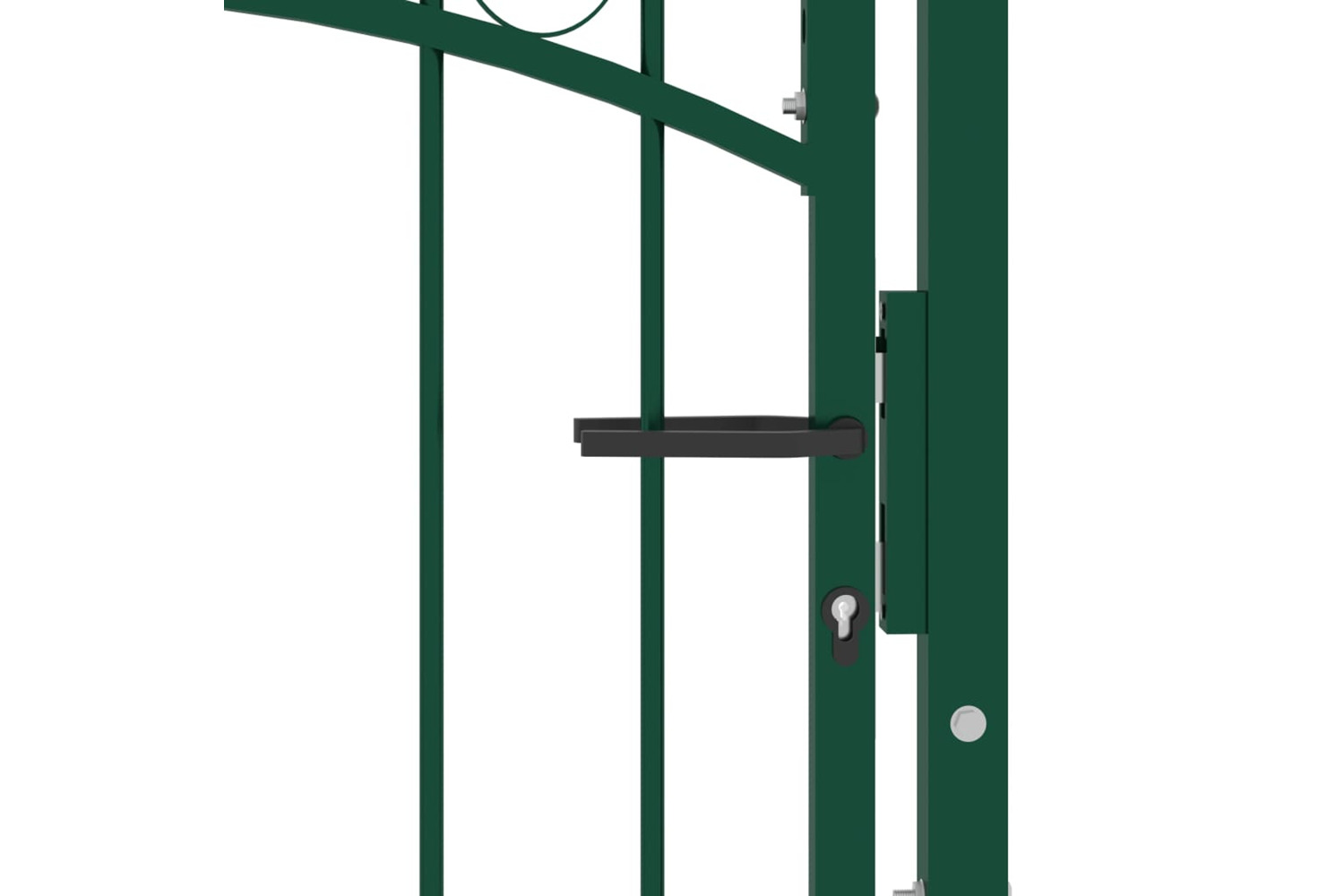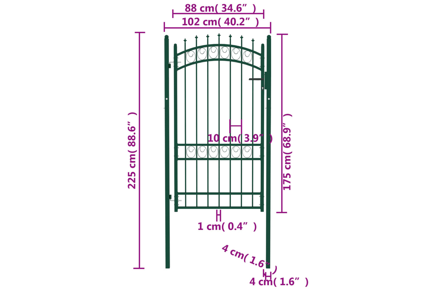 Manufactured from heavy-duty steel, the fence gate has a sturdy construction and has been powder coated against rust and corrosion. With the vertical bars featuring spikes and strong horizontal brace as the reinforcement, this garden gate provides a high degree of security. The arched top design adds to its elegance. It comes with two solid posts along with sturdy hinges for easy installation, and a locking system with three matching keys is also included in delivery.