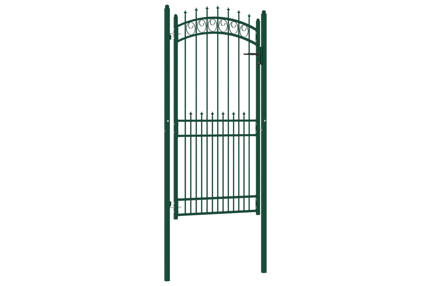 Manufactured from heavy-duty steel, the fence gate has a sturdy construction and has been powder coated against rust and corrosion. With the vertical bars featuring spikes and strong horizontal brace as the reinforcement, this garden gate provides a high degree of security. The arched top design adds to its elegance. It comes with two solid posts along with sturdy hinges for easy installation, and a locking system with three matching keys is also included in delivery.
