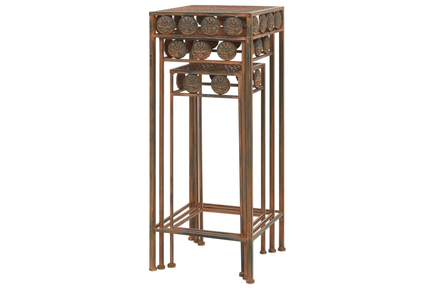 The plant stands are made of metal with an antique-look rusty finish and beautiful, decorative details, which will give your home an air of elegance. Delivery includes 3 stands in different sizes. The nesting plant stands can be stored underneath each other to save space.