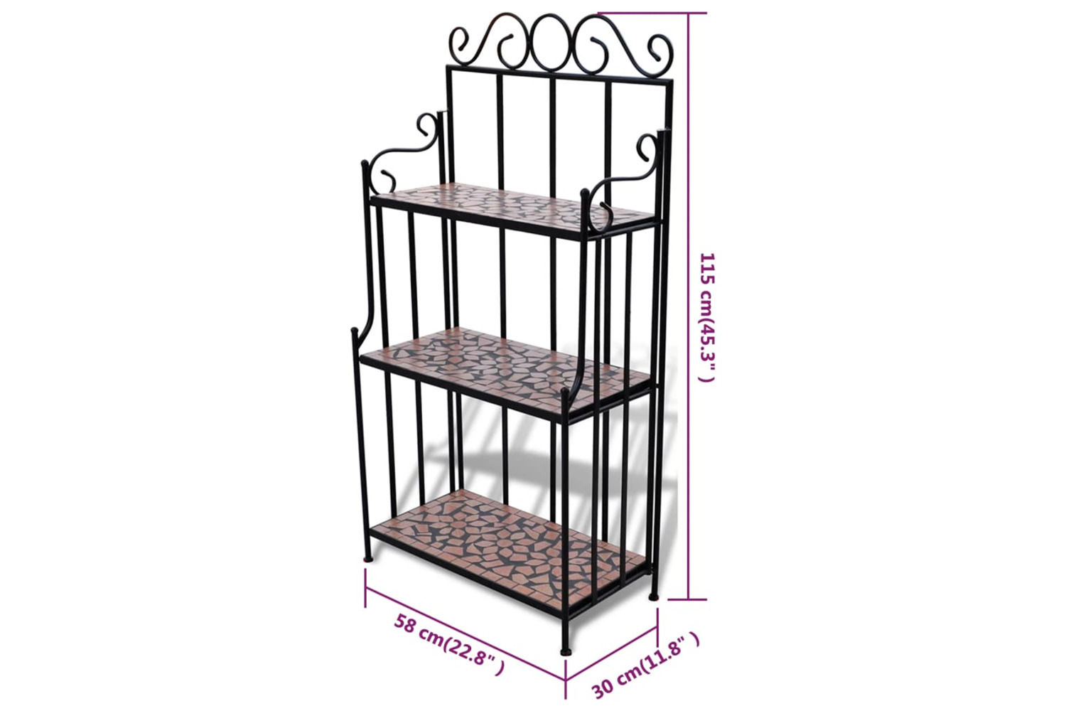 The 3-layer plant rack has a height of 115 cm, and could be perfectly placed against any wall. Its iron frame contributes to the sturdiness, while the ceramic top is also easy to clean. It is very durable for a long-term service life. Please note this product is not suitable to be left outside in cold condition.