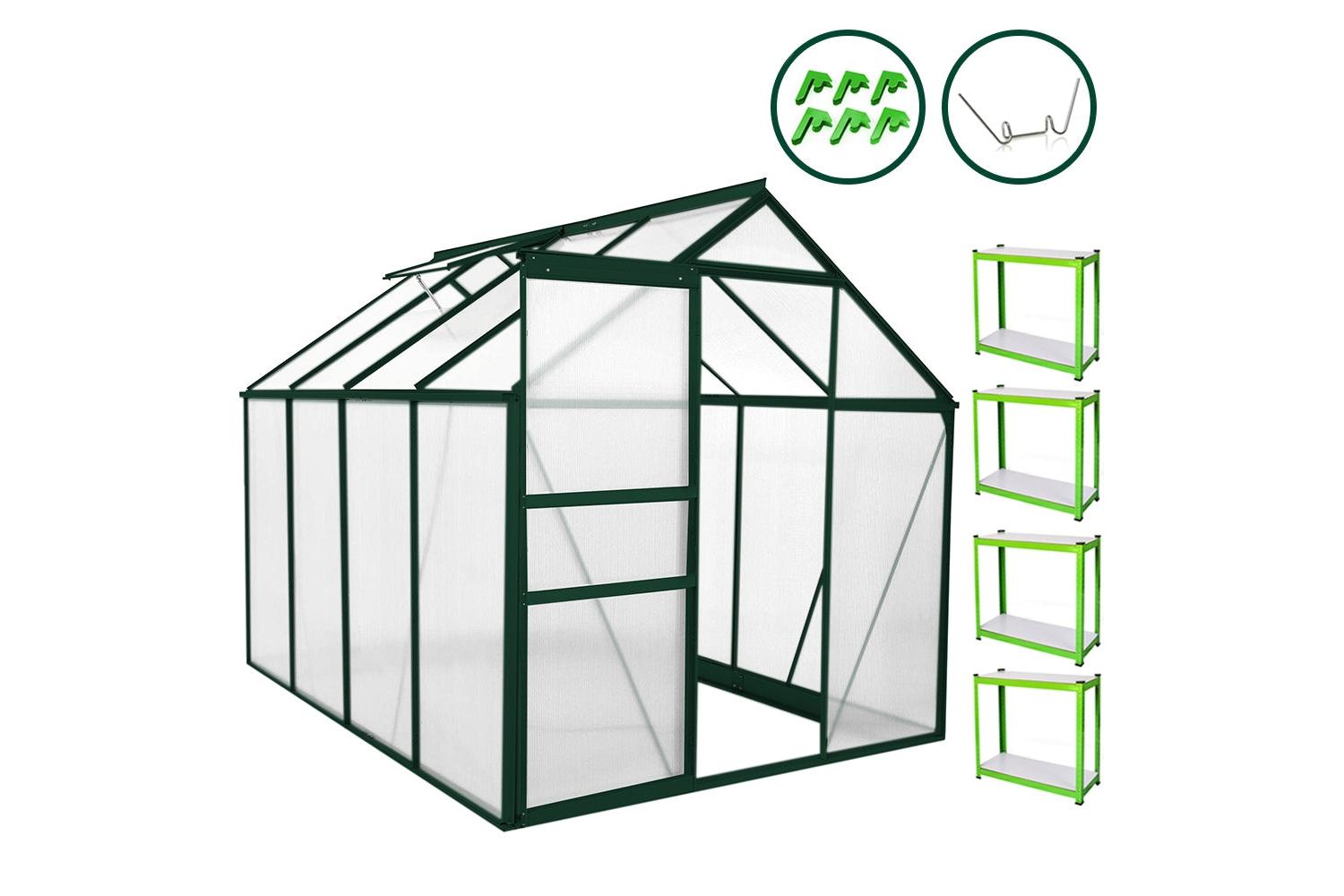 This impressive 6ft x 8ft greenhouse buffers your plants against harmful UV rays with its shatterproof twin wall PC sheets, handily maintaining your plant health. The robust aluminium structure, enforced by diagonal support beams is designed to sturdily weather stormy elements fitting into the Irish climate.