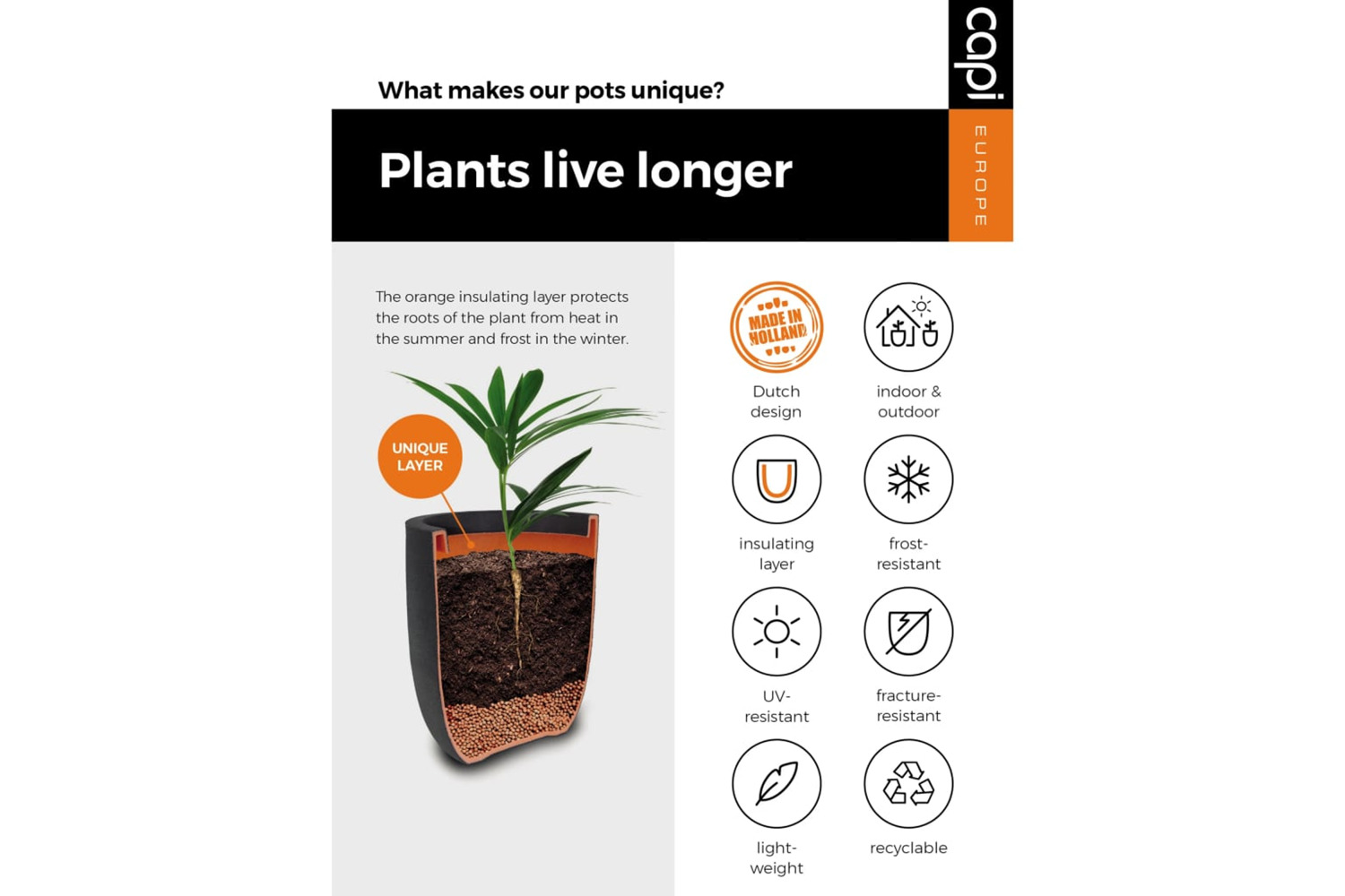 This durable Capi flowerpot is made in Holland from recycled materials and with climate neutral production methods, for which Capi Europe was awarded the CO2 Neutral Product and Company label in 2020. All pots are suitable for both indoor as outdoor use and are 100% recyclable. Despite the robust exterior, the pots are lightweight and weather resistant. Its unique double-walled design provides additional protection against the heat in the summer as well as frost in the winter. Thus, your plants have a longer life! This insulation layer is denoted by the orange interior shown in the images.